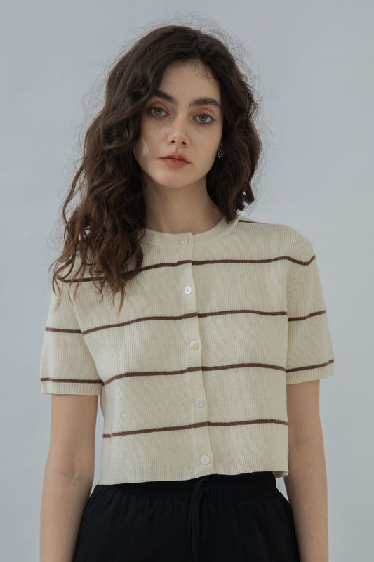 Short Sleeve Stripes Knit Top (Beige Stripes)