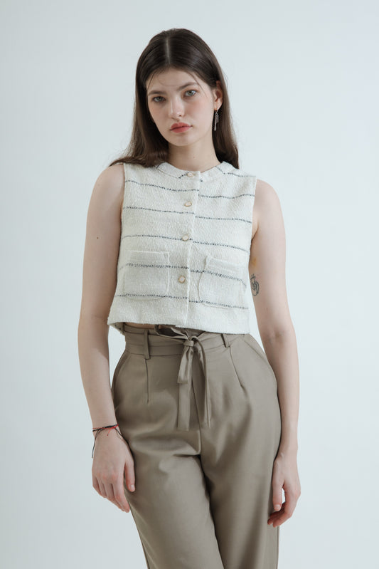 Sleeveless Striped Pocket Crop Top (Striped), made from 100% Polyester, is a stylish and functional...