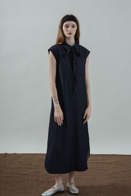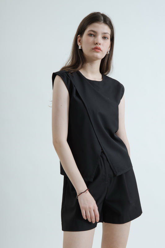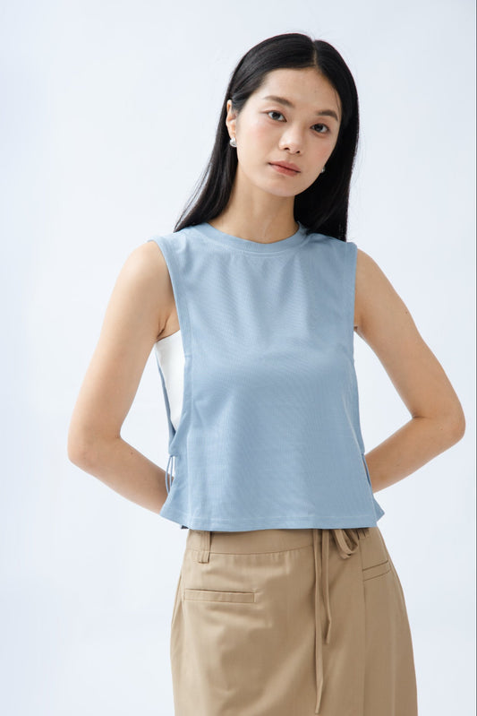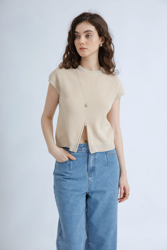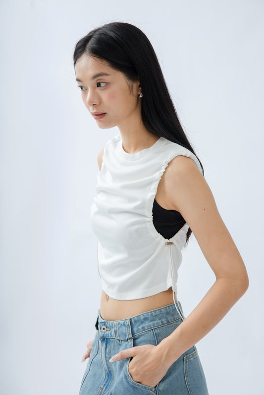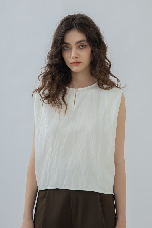 Round Pleated Neckline Sleeveless Top (Ivory)