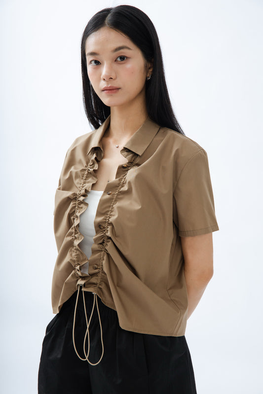Effortless with a twist — this top features a statement drawstring down the front, allowing...