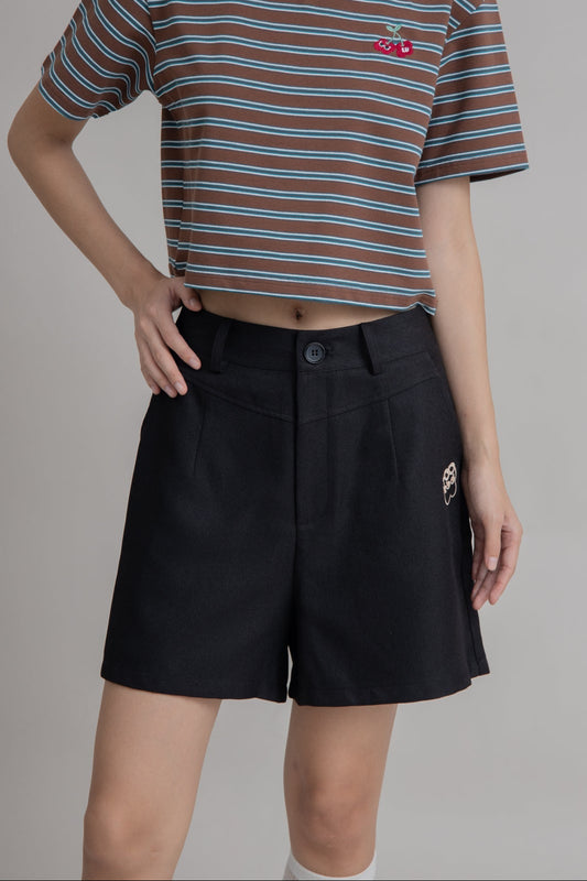 Keep it playful and stylish with these black shorts, featuring a unique V-shaped cutline that...