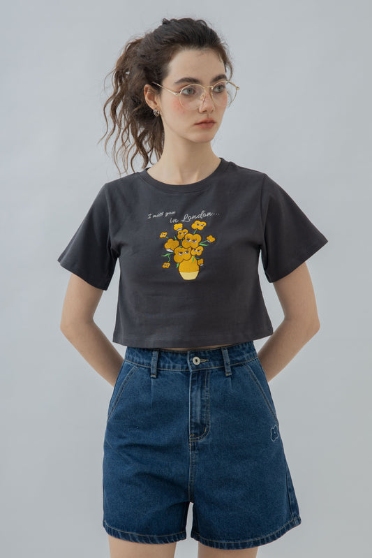 LULU Flower In A Vase Embroidery Crop Tee (Dark Grey)