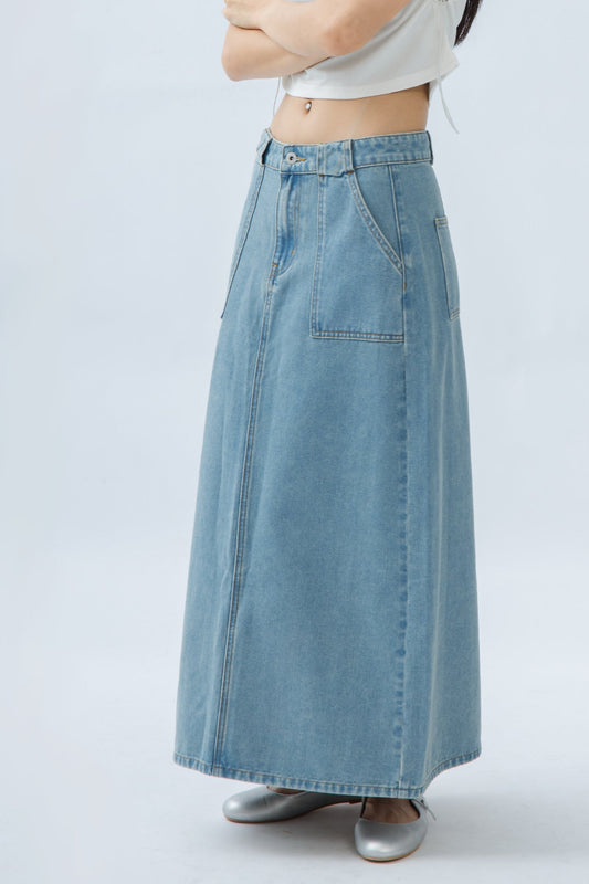 Timeless and flattering, this high-waist A-line denim long skirt features a clean silhouette that gently...