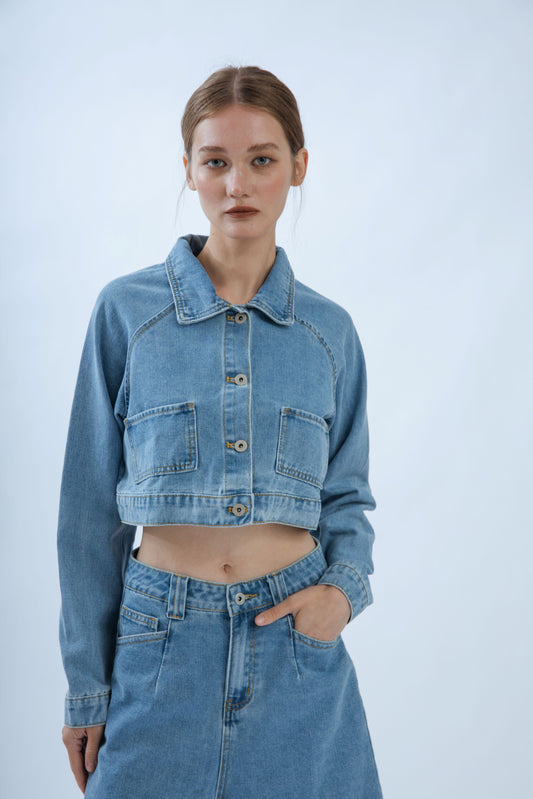 A modern twist on a timeless classic. This cropped denim jacket features a structured silhouette...