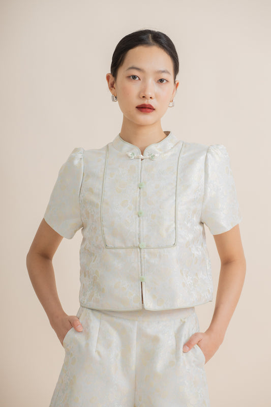 Jacquard Cheongsam Short Sleeve Top (Pale Green)