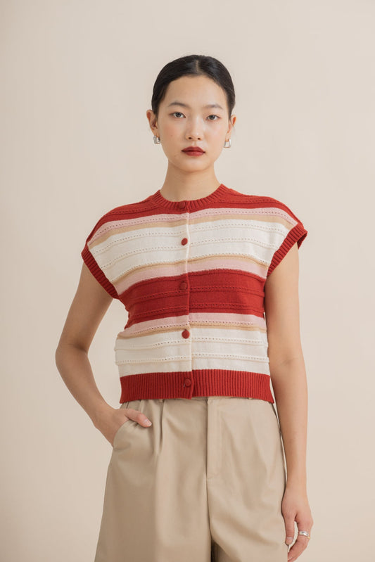 Elevate your layering game with this striped knit vest, featuring a round neckline and button-down...