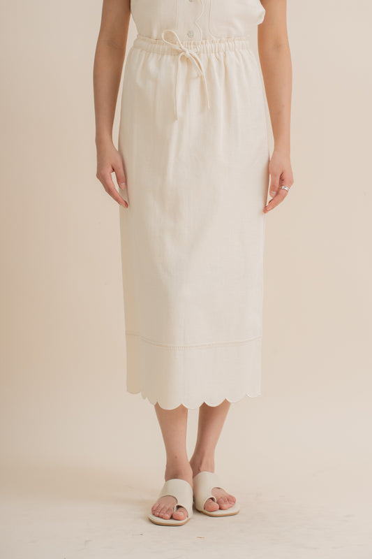 Slip into effortless charm with our Scallop Hem Drawstring Long Skirt, crafted from 100% Cotton...