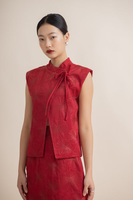 This modern cheongsam-style top blends traditional elegance with a fresh, youthful silhouette. Crafted from 100%...