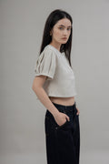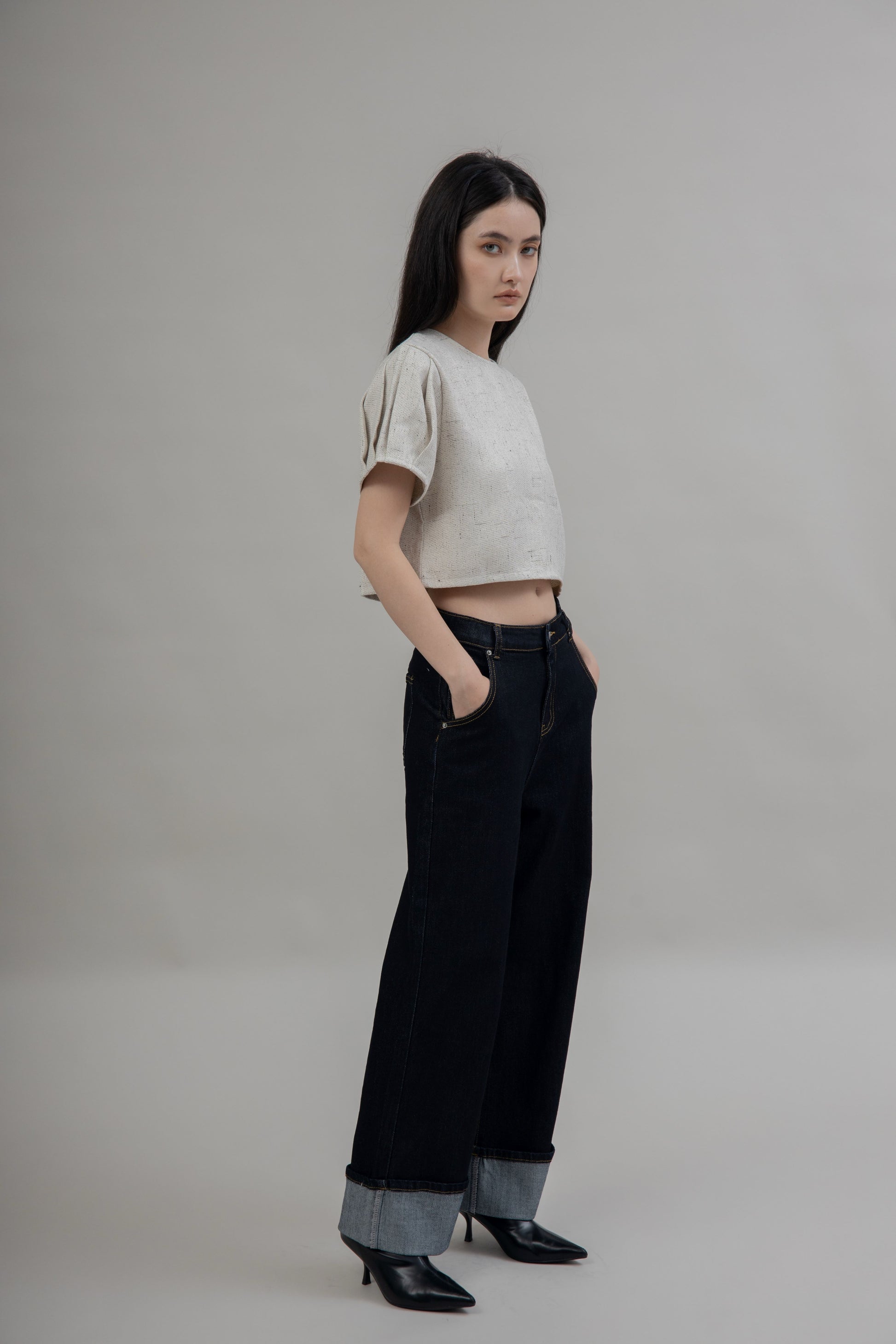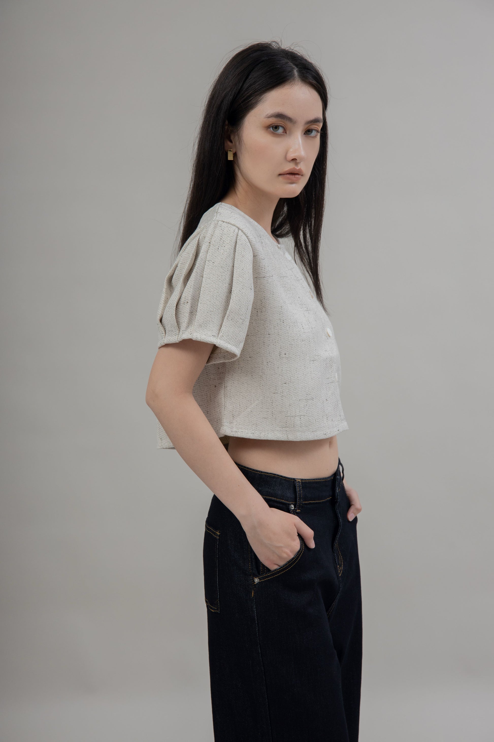 This top is made from 100% Polyester, giving you a durable, non-stretch tweed fabric for all-day wear. With a classic round neckline and pleats at the sleeve, it features a unique two-way design that can be worn both forward and backwards. Enjoy stylish versatility and timeless comfort.