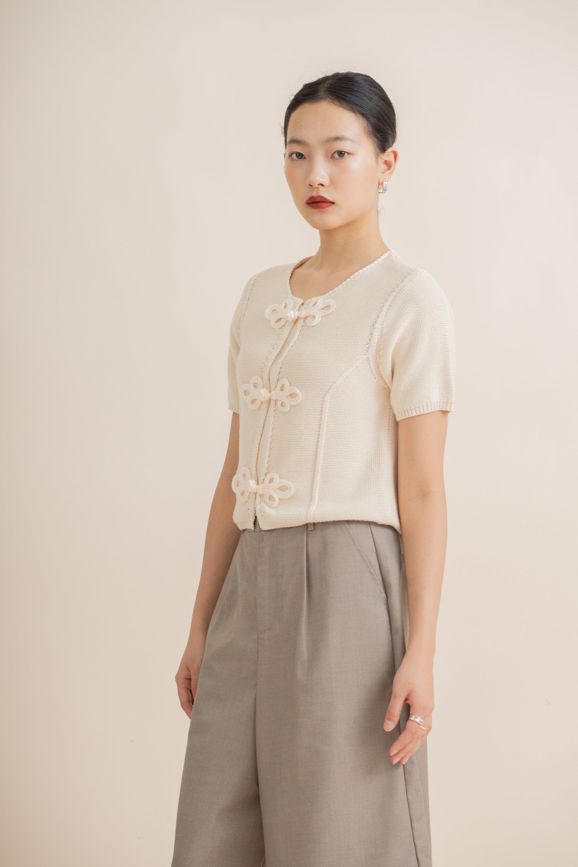 Chinese Knot Down Knit Top (Beige)