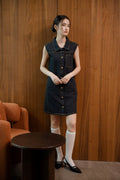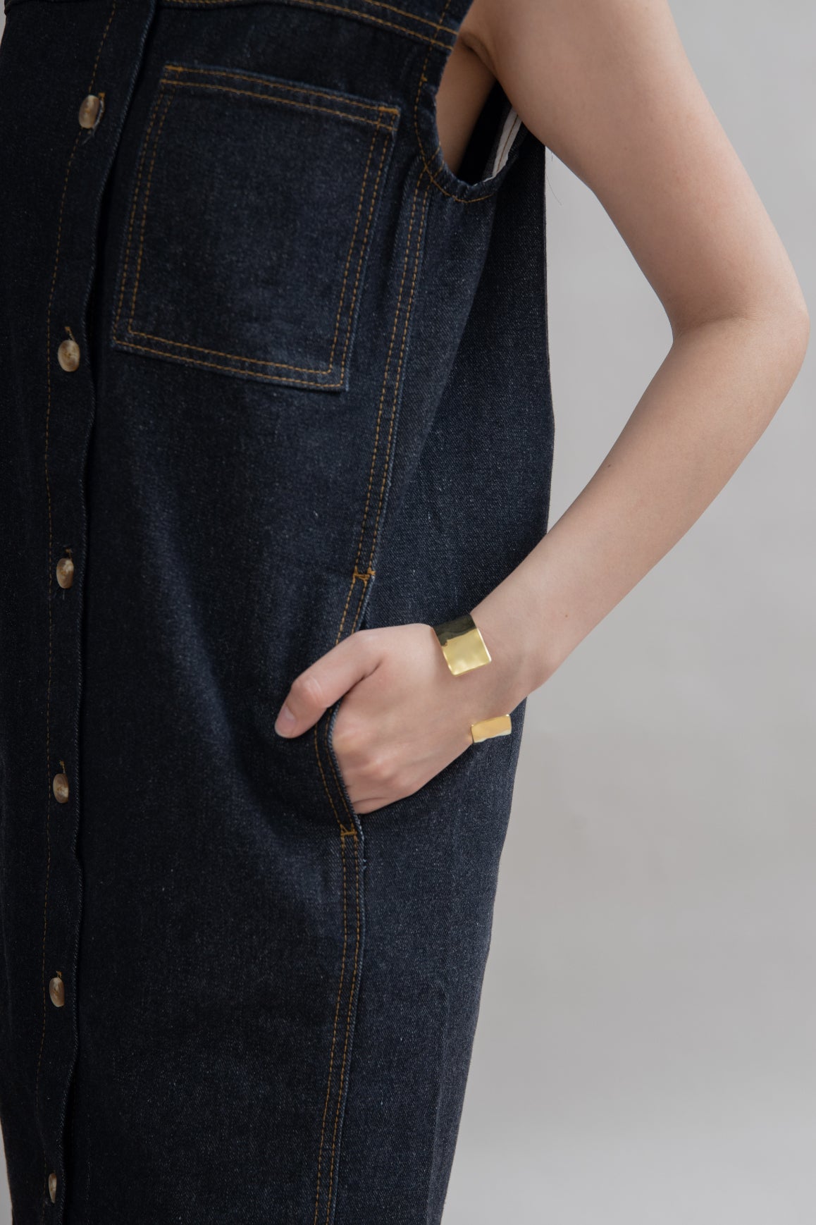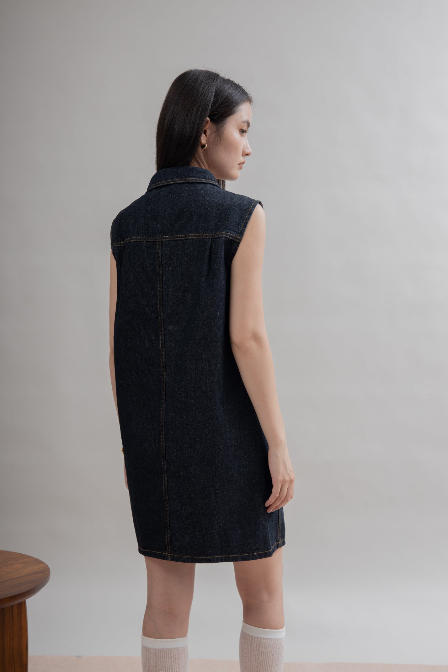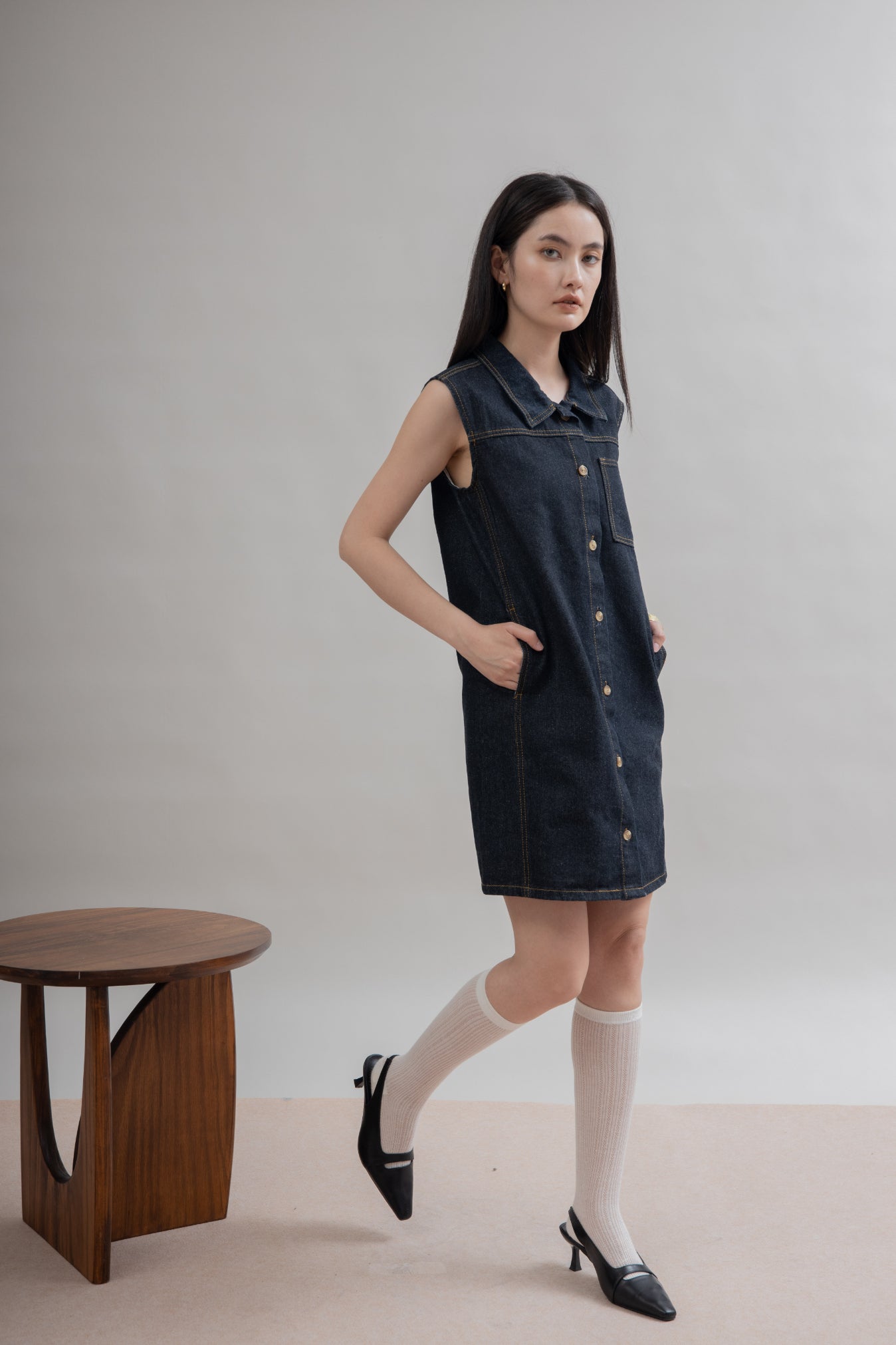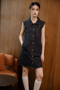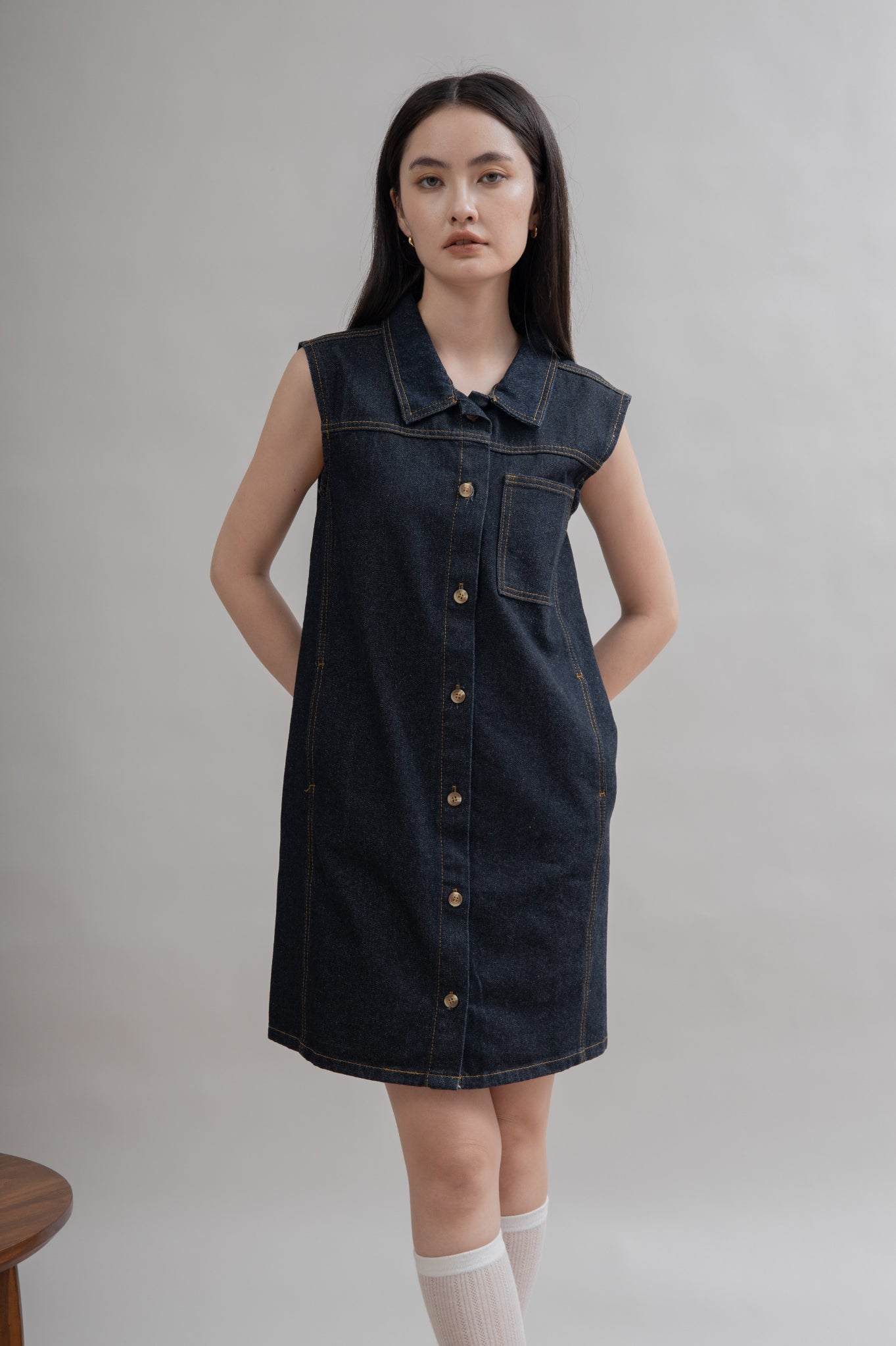 This sleeveless denim dress brings a structured edge to warm-weather dressing. Crafted from 100% cotton for an authentic denim feel, it features a sharp collar, button-down front, and a single chest pocket for a touch of workwear charm. The clean silhouette and contrast stitching make it perfect for styling solo or layered—effortlessly bridging casual and statement looks.