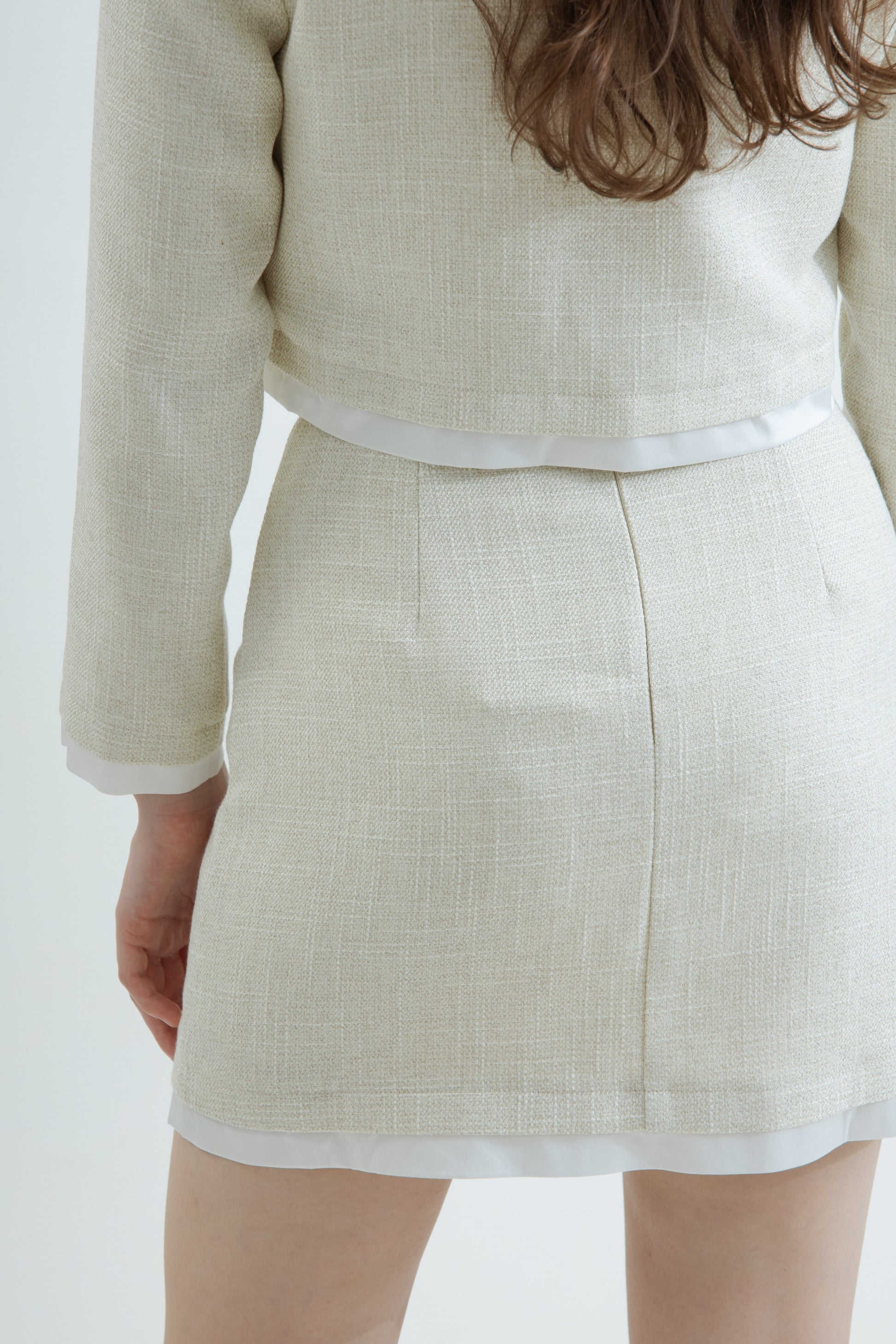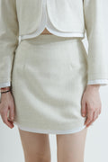 Double Layered A-Line Skirt, made of 100% polyester, features a tweed-inspired knit fabric. It includes an invisible zipper at the back and built-in inner shorts. Its versatile and chic faux two-piece design makes it a perfect wardrobe staple.