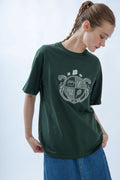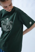 Elevate your casual wardrobe with this premium oversized tee. Crafted from 100% pure cotton, this T-shirt offers exceptional comfort, breathability, and a relaxed fit that's perfect for everyday wear. The centerpiece is a unique embroidered crest graphic, blending modern style with classic emblem elements — including subtle nature and lifestyle icons divided into four quadrants. Set against a rich forest green backdrop, this tee combines effortless style with thoughtful detail.