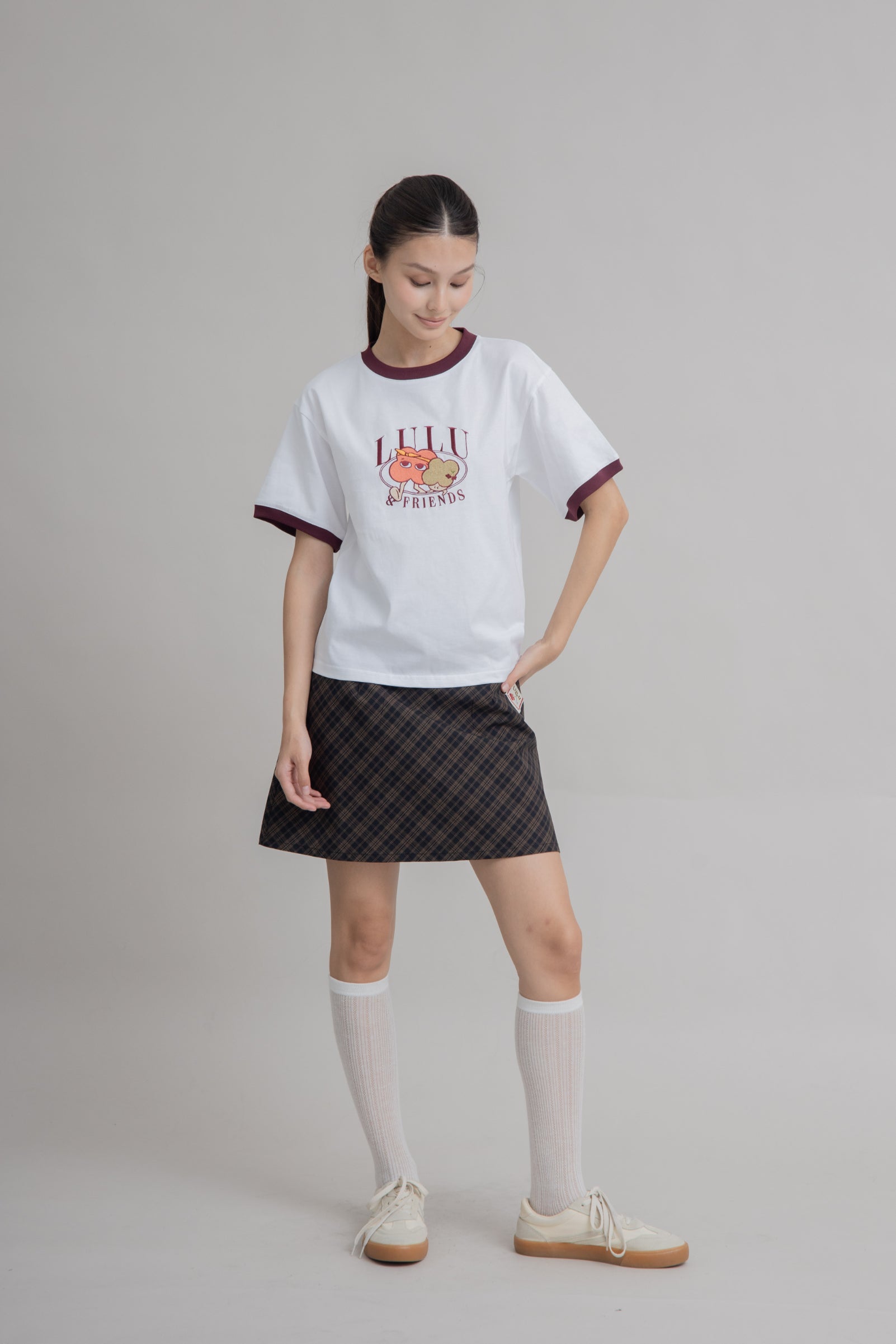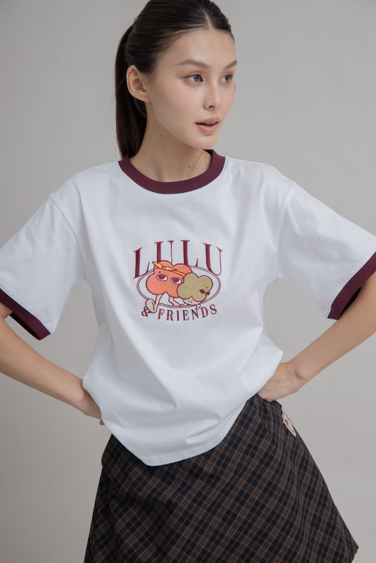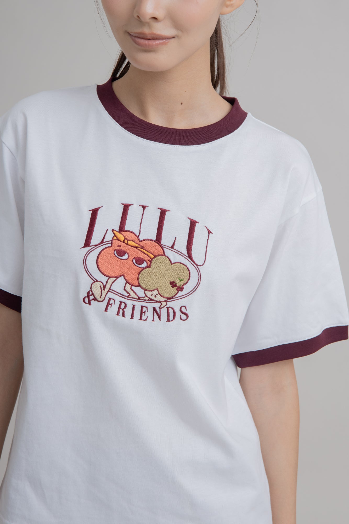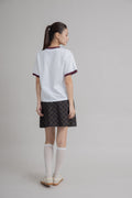A little sporty, a little sweet — this short tee is designed with a contrasting maroon collar and sleeve hems for a pop of color against its clean base. At the heart, a delicate Lulu & Friends embroidery adds a charming touch of detail. Made from 100% cotton, it’s soft, breathable, and perfect for an effortlessly cute everyday look.