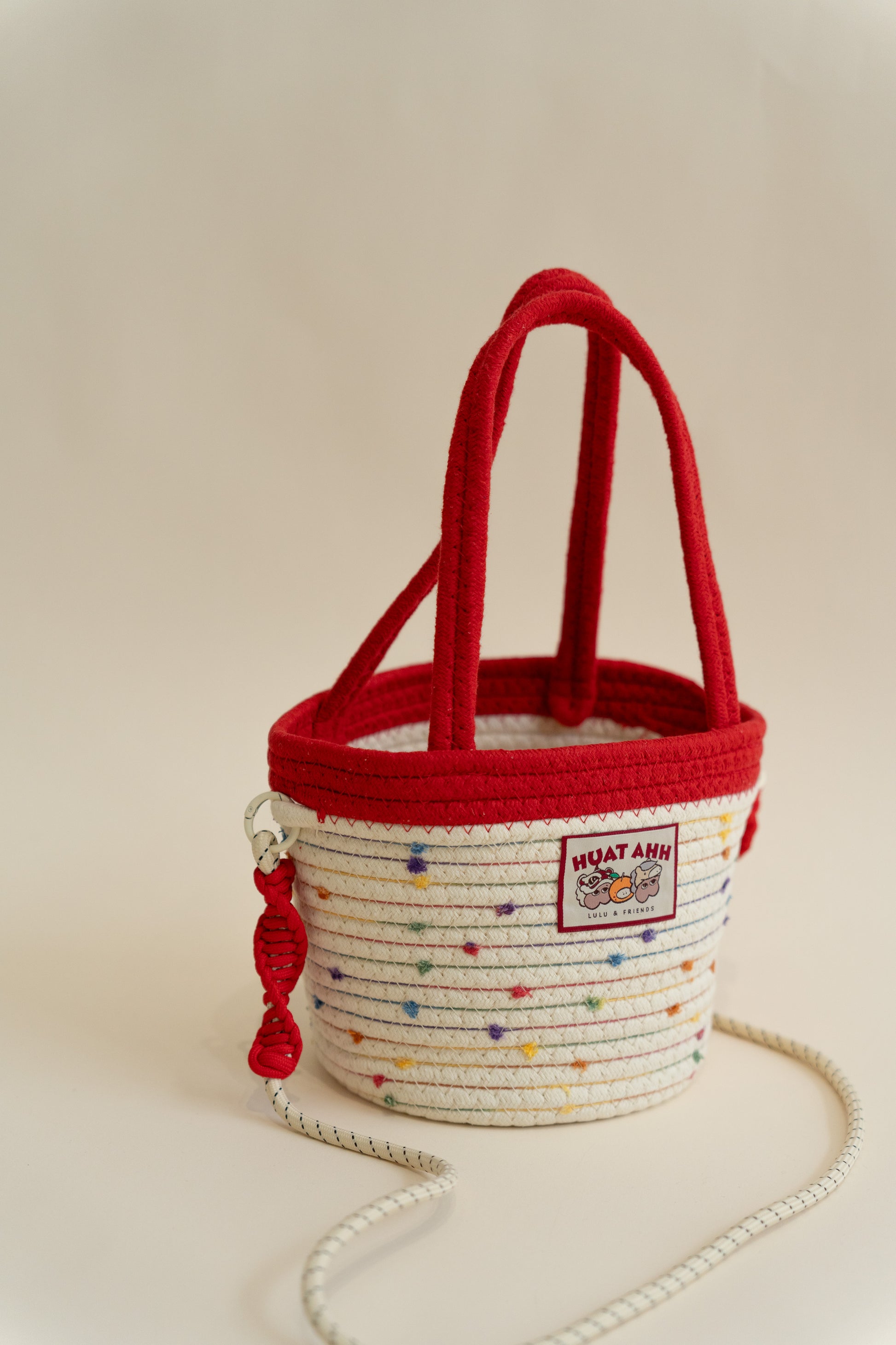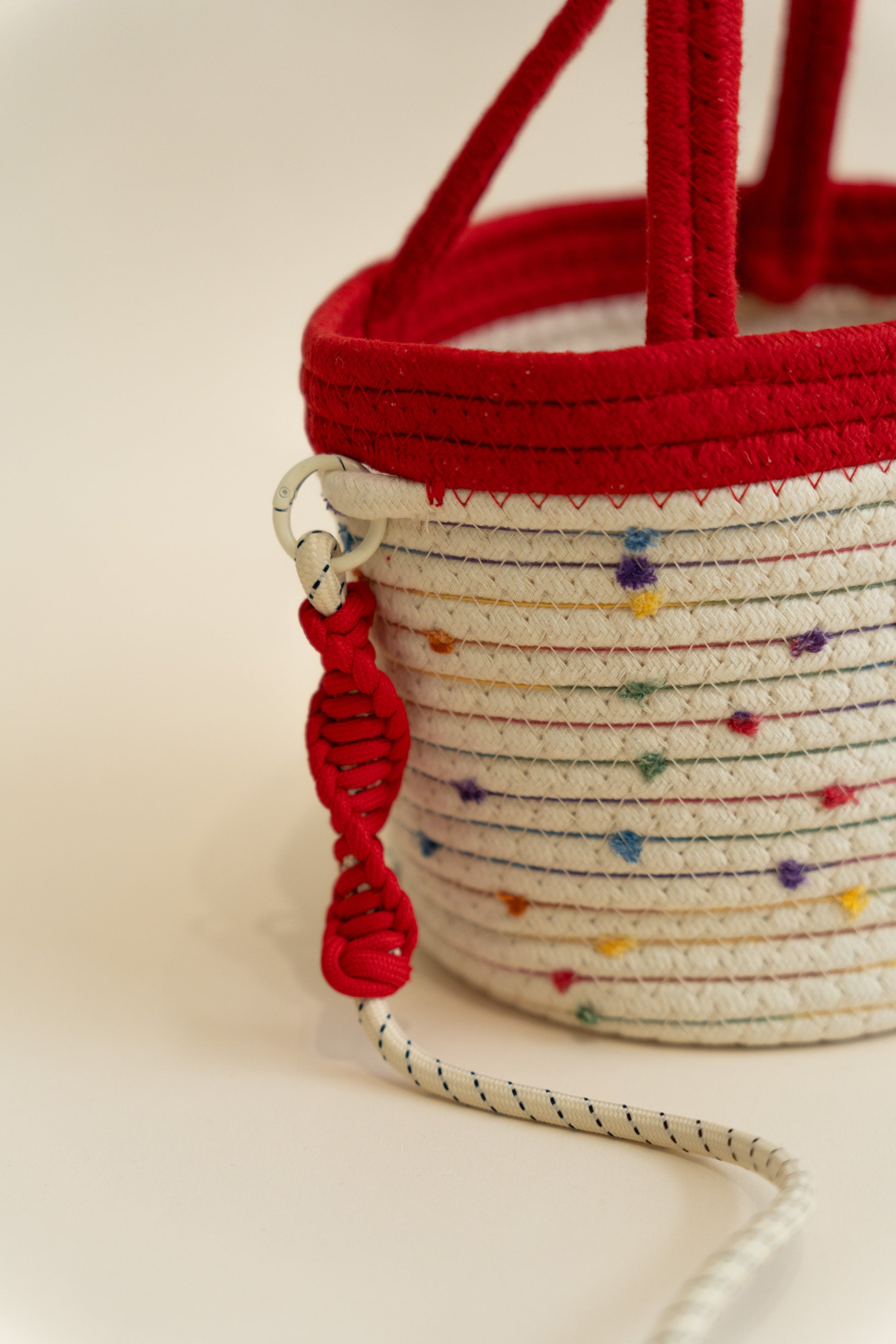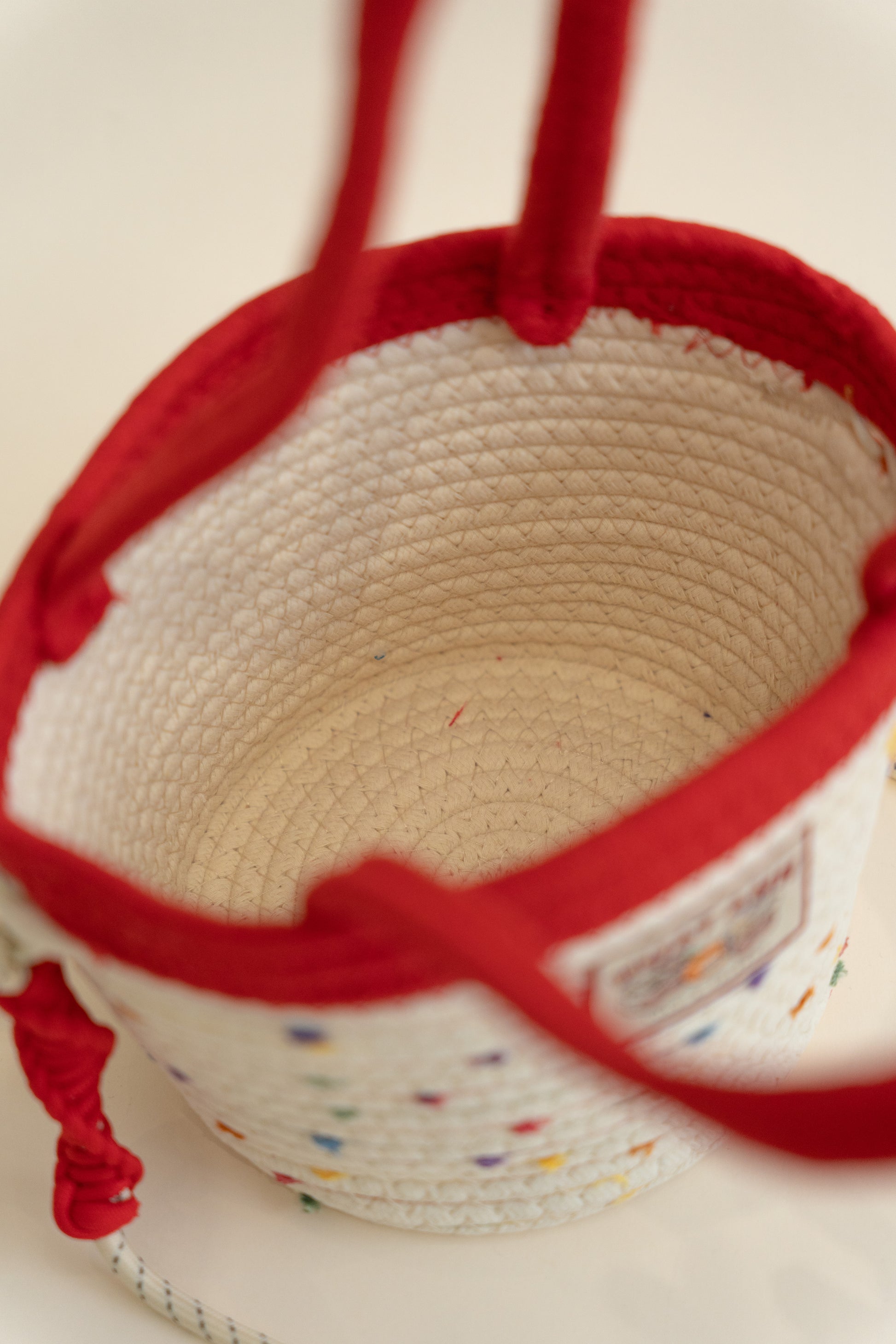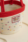 Add a playful touch to your everyday look with this colorful woven bucket bag. Crafted from soft, rope-style material, the bag features a natural cream base sprinkled with colorful specks for a fun, confetti-like effect. A cute embroidered patch on the front adds personality, while the versatile design lets you carry it by the handle for a chic hand-held look or sling it over your shoulder for a casual & effortless look. Perfect for anyone who loves quirky, cheerful designs with a practical twist.