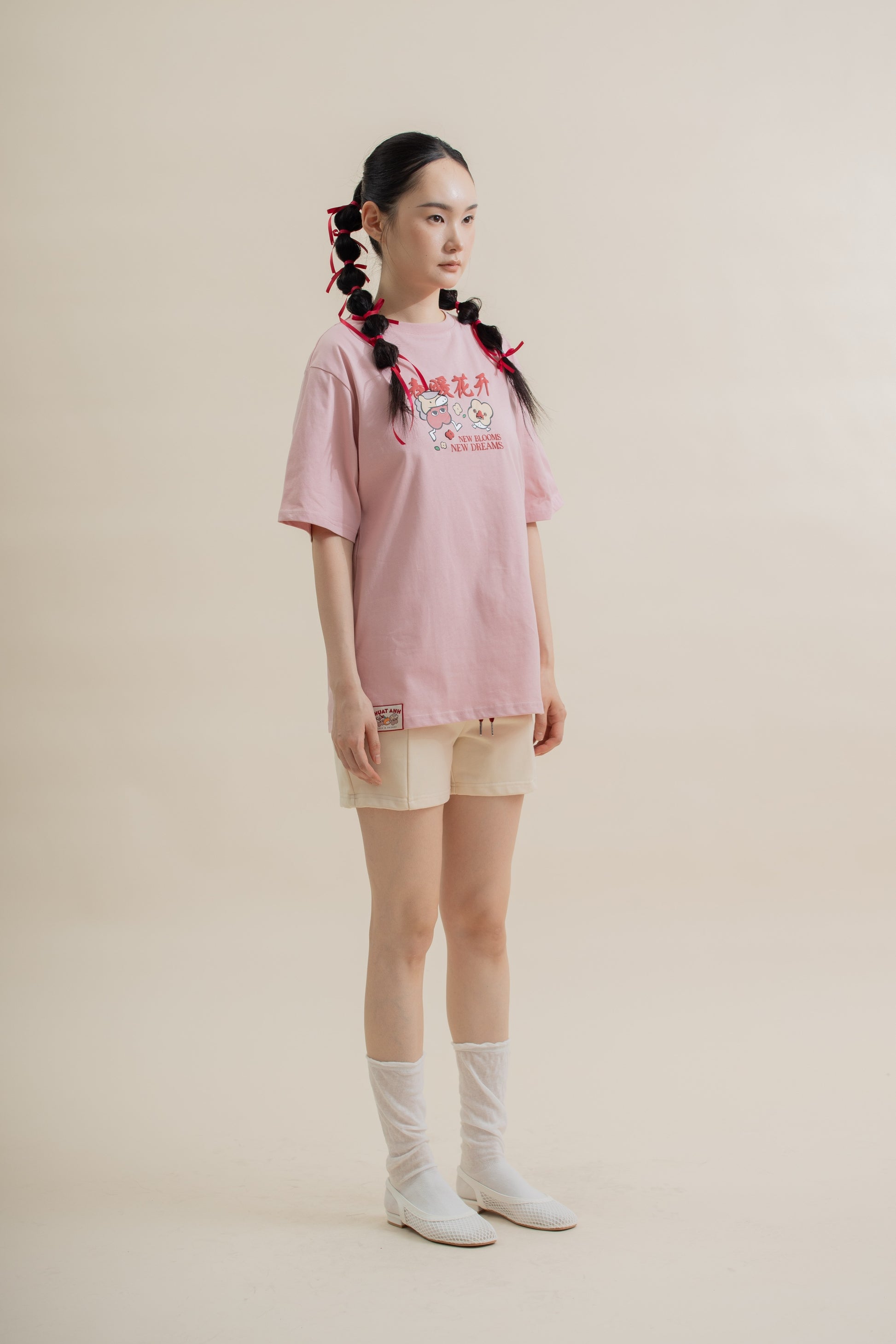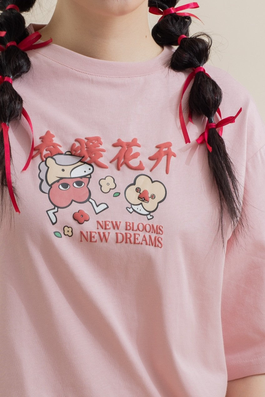 Soft, playful, and full of spring energy — this 100% cotton oversize tee features puff print wording “春暖花开 · New Blossoms, New Dreams” with adorable LuLu and Friends graphics. The raised lettering adds a fun 3D texture, while the relaxed silhouette keeps it comfy and easy to style. A perfect everyday piece that brings warmth, optimism, and charm to your look.