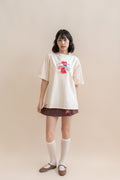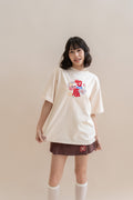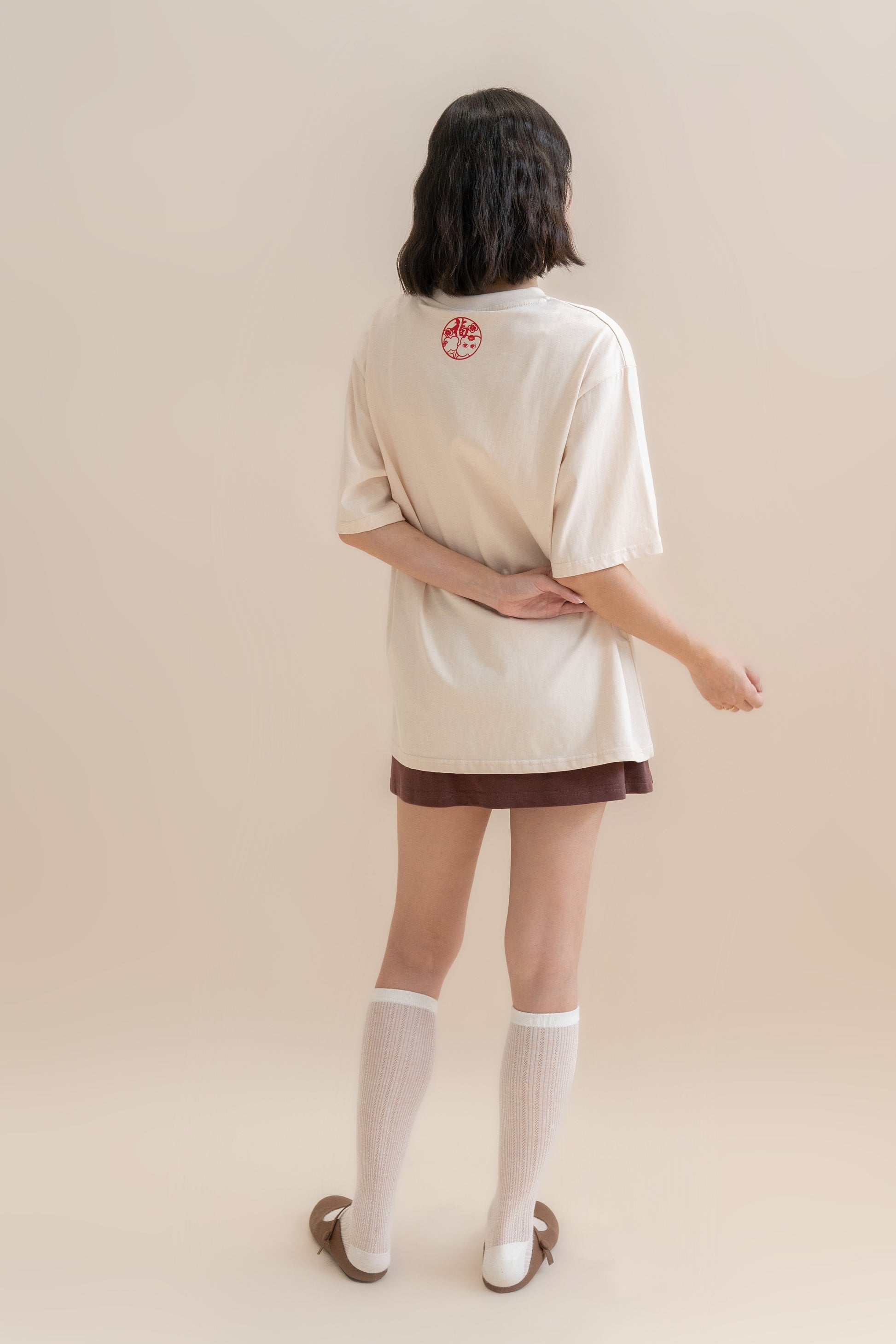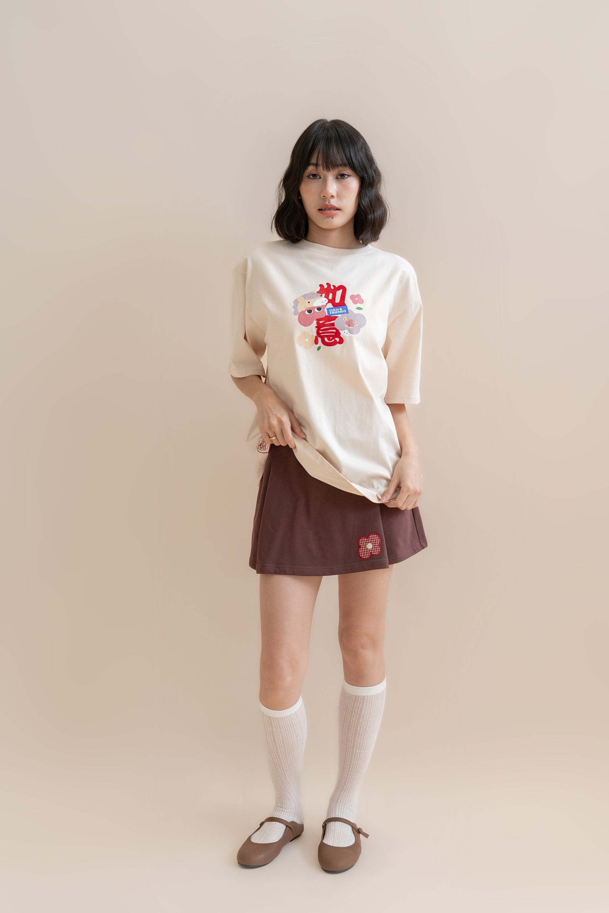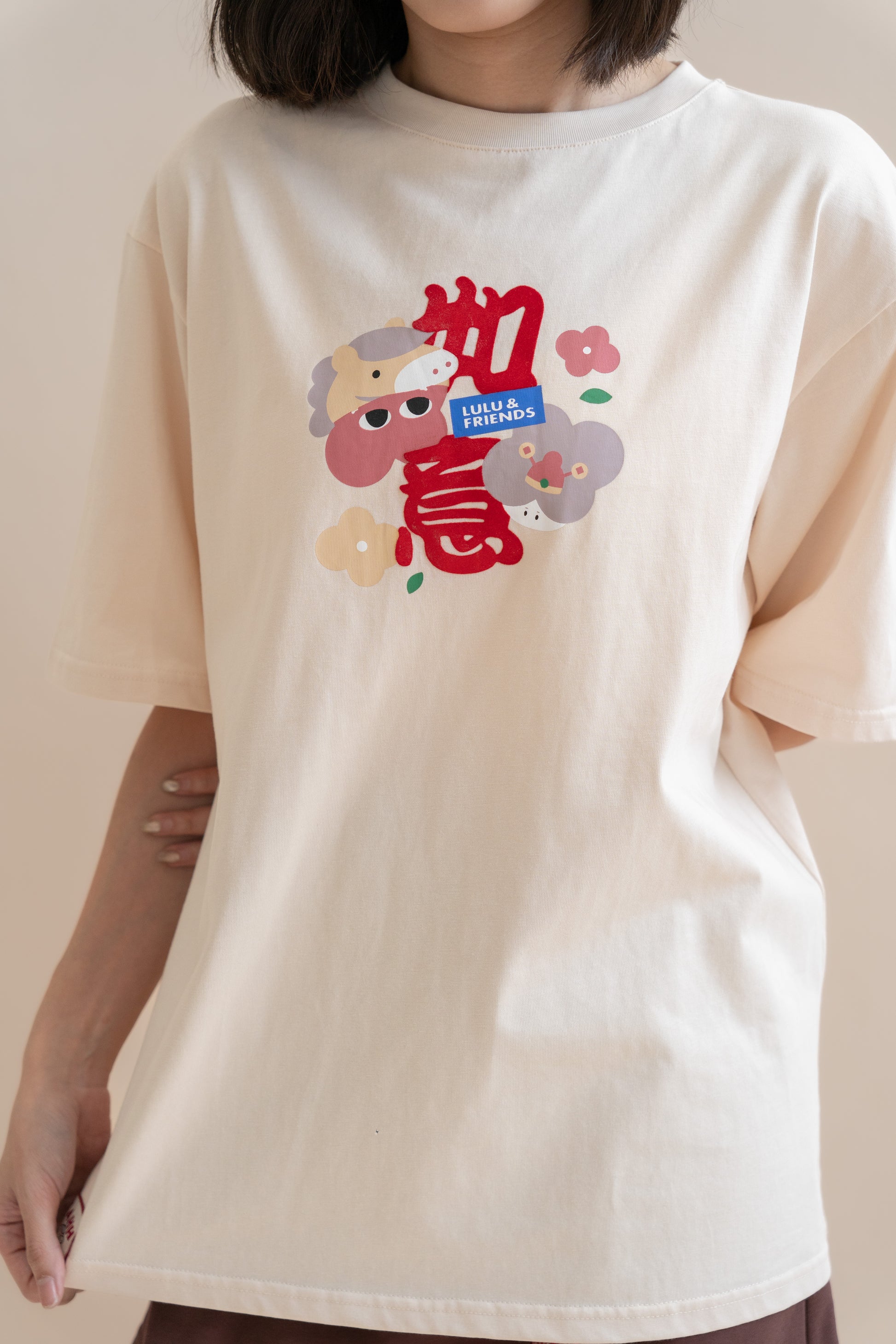 Add a touch of whimsy to your everyday style with this beige tee from LULU, featuring a cute Lulu and Friends graphic and the “如意” motif in vibrant red flock print for a playful pop of color. Made from 100% soft cotton, it’s breathable, comfortable, and perfect for casual wear. Pair it with jeans, skirts, or shorts for an effortlessly cute and cozy look.