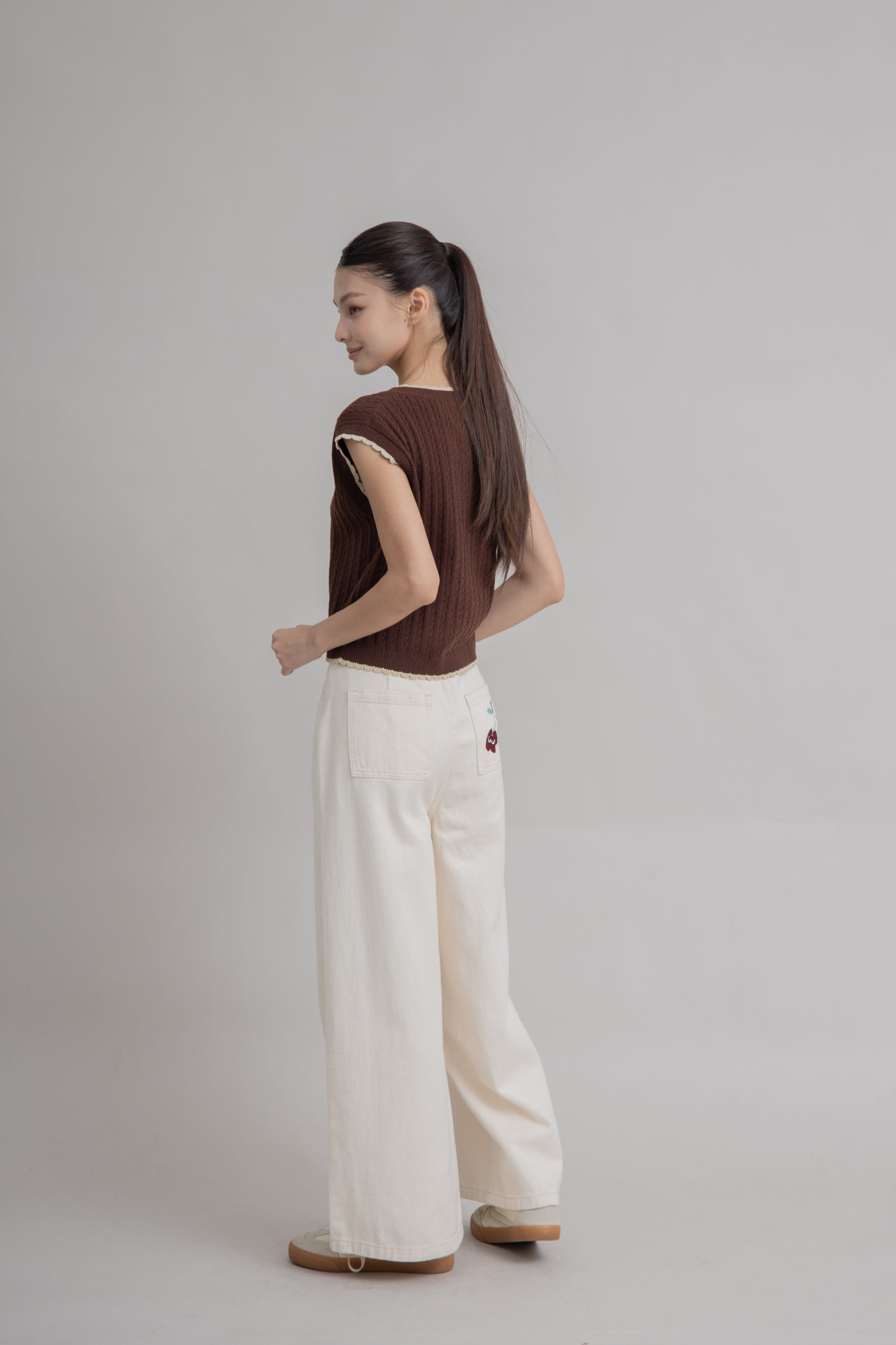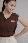 Add a touch of playful charm to your layering looks with this brown knit vest, featuring a ribbed texture and a flattering V-neckline. Designed with contrast cream scallop trim for a sweet finishing touch, it’s accented by an adorable LULU cherry embroidery at the chest. Made from 90% recycled polyester and 10% nylon, it’s soft, sustainable, and perfect for styling over shirts, blouses, or tees for that effortlessly cute vibe.