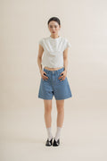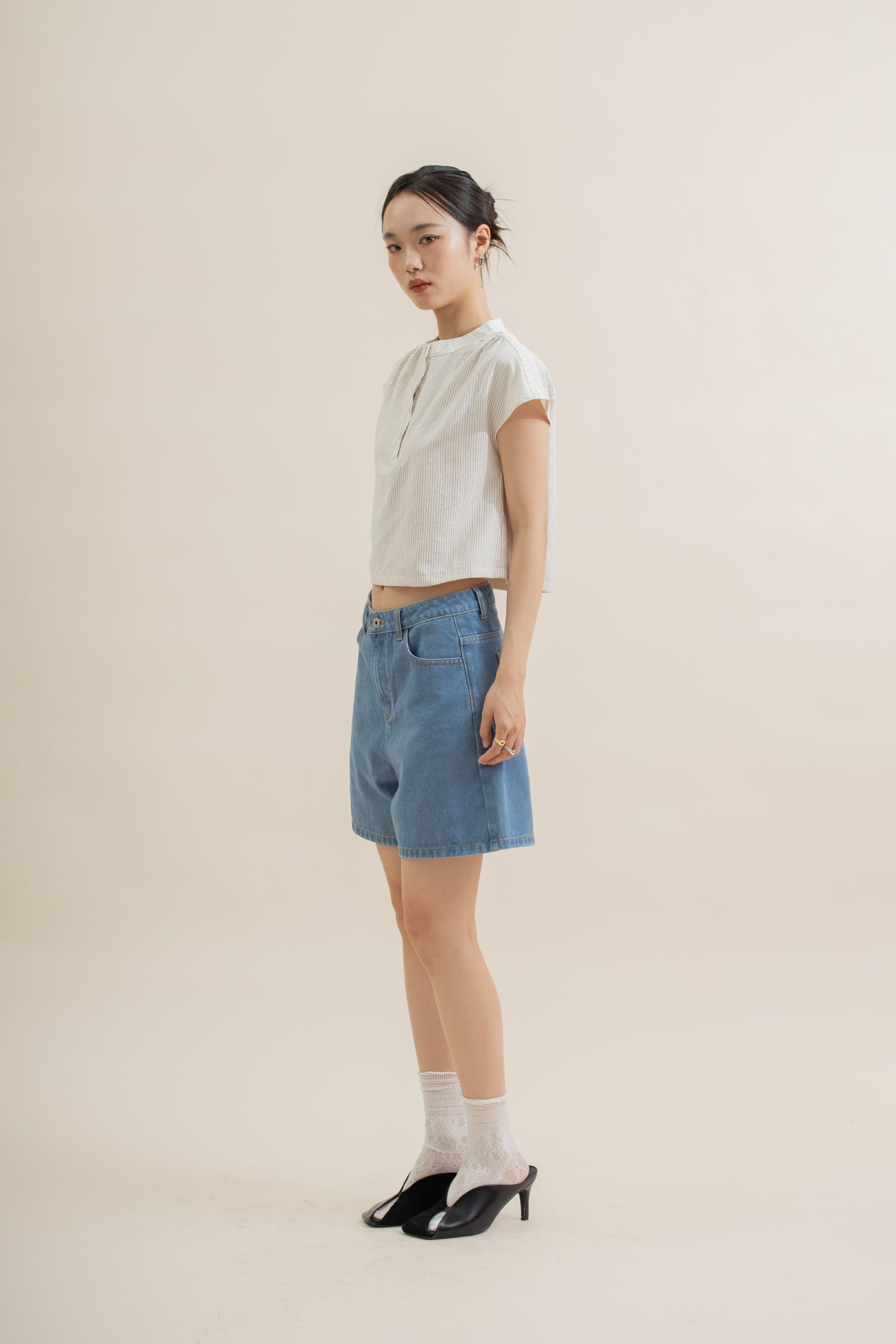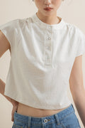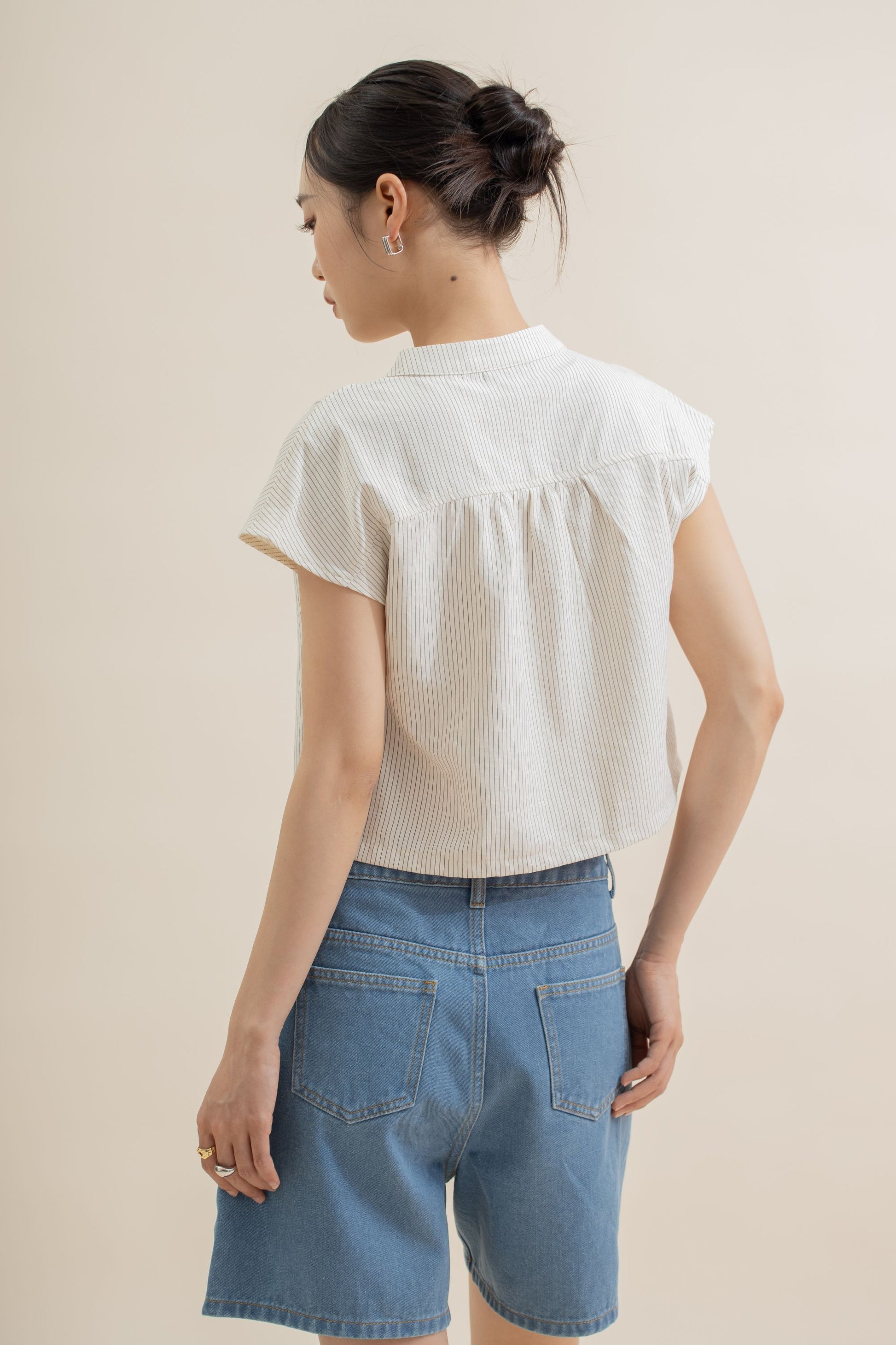 A blend of modern minimalism and subtle oriental charm. Made from a blend of 90% Polyester, 10% Nylon, this cap-sleeve top features a mandarin collar and clean button-down front, elevated with soft beige stripes for a touch of quiet sophistication.