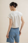 Mandarin Collar Cap-Sleeve Top (Beige Stripes)