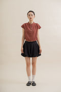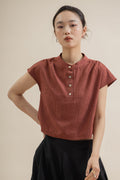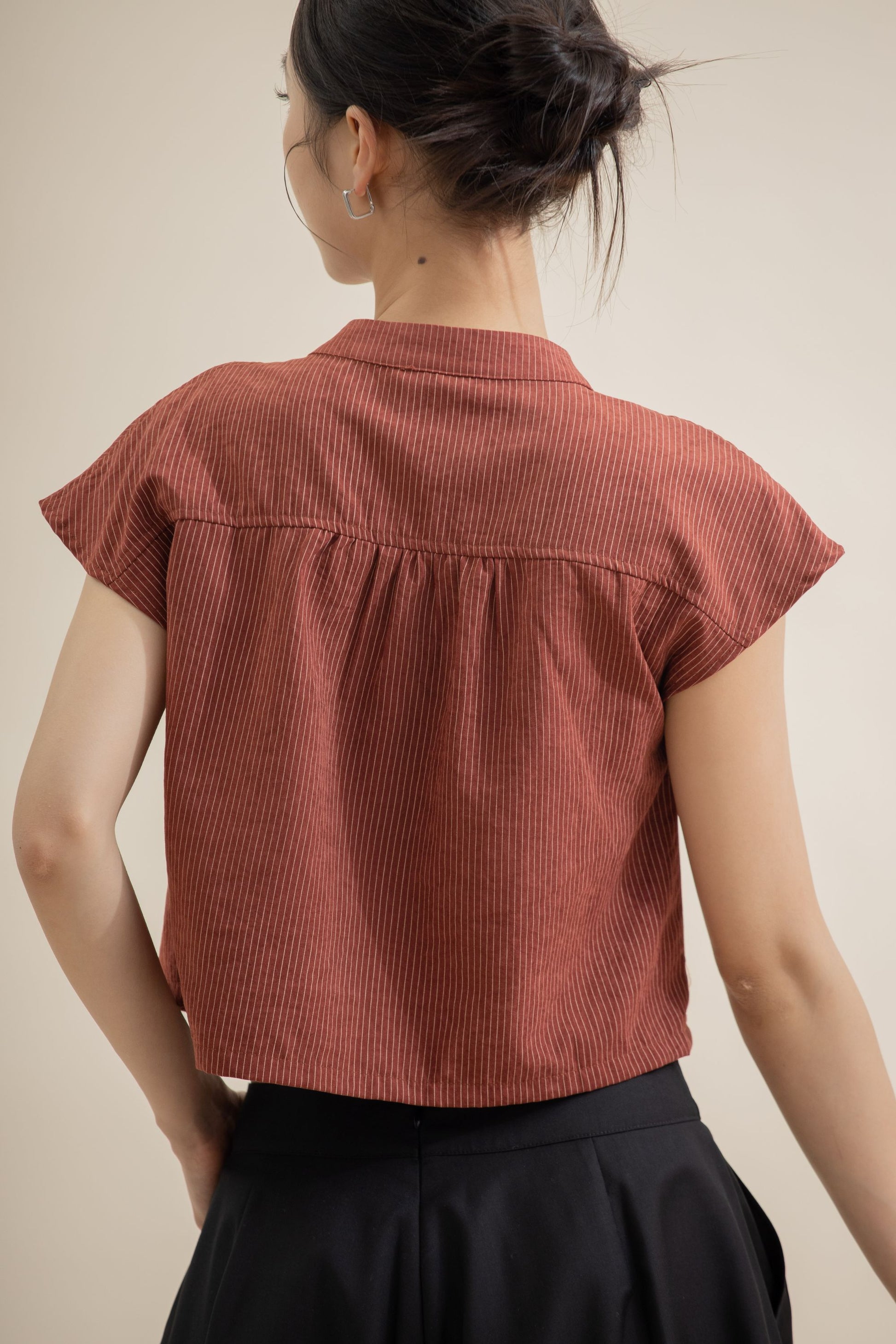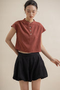 Mandarin Collar Cap-Sleeve Top (Red Stripes)