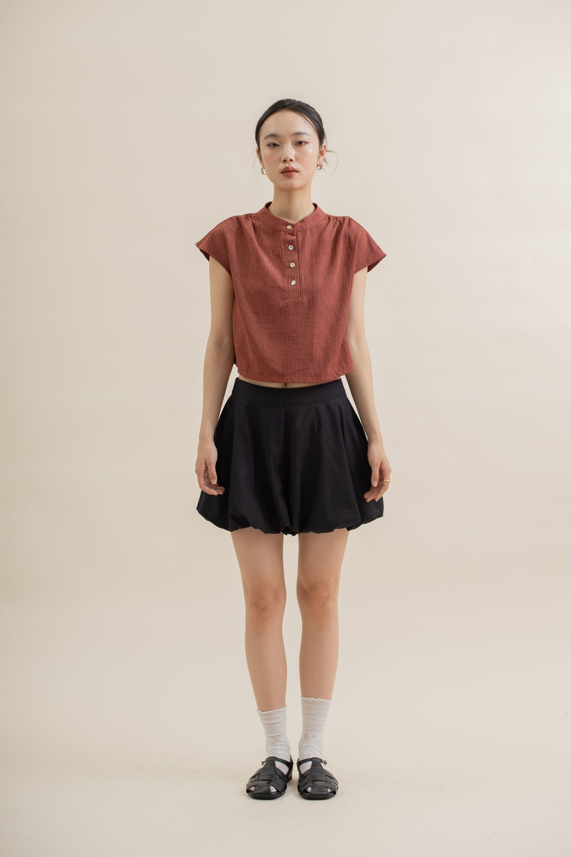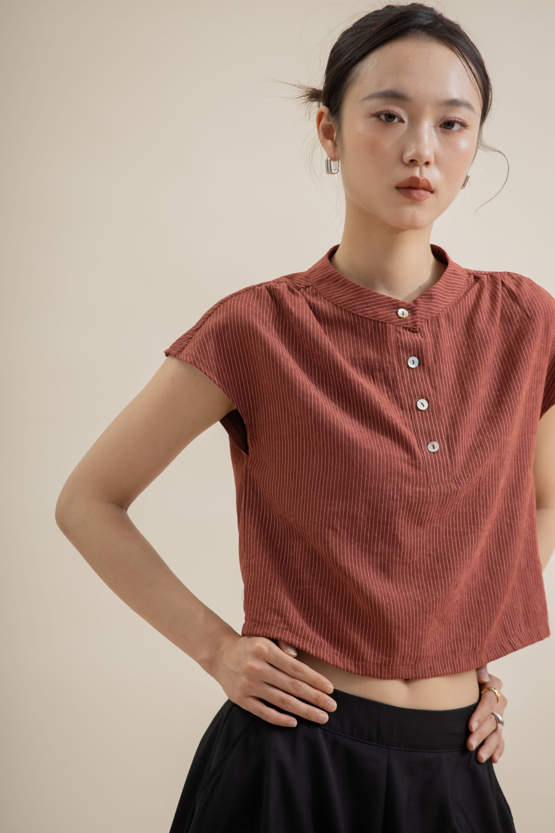 A blend of modern minimalism and subtle oriental charm. Made from a blend of 90% Polyester, 10% Nylon, this cap-sleeve top features a mandarin collar and clean button-down front, elevated with soft beige stripes for a touch of quiet sophistication.