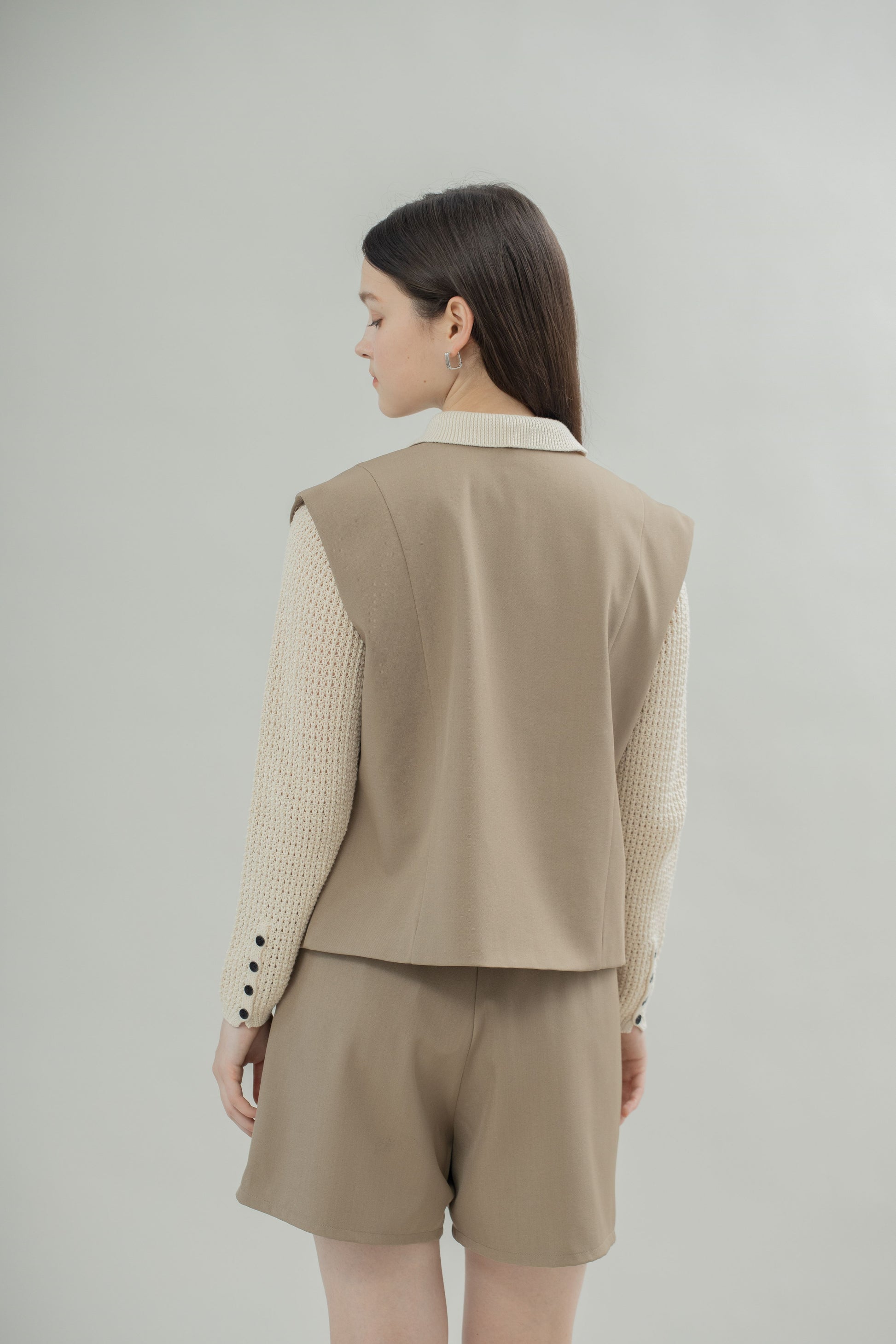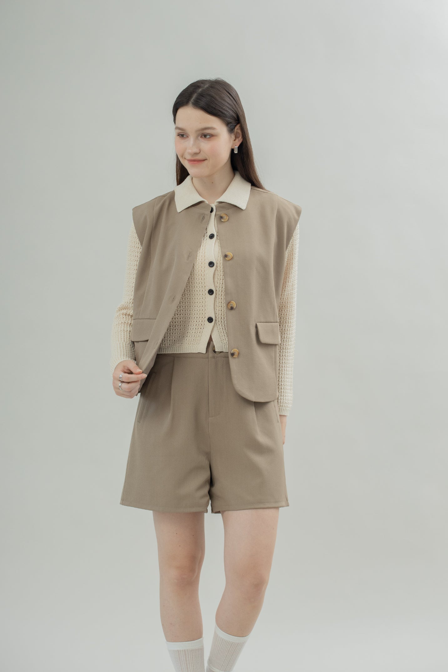 This round neck vest features two functional front pockets that add both style and practicality. Designed in versatile khaki and brown, it brings a warm, earthy tone to any outfit.
