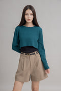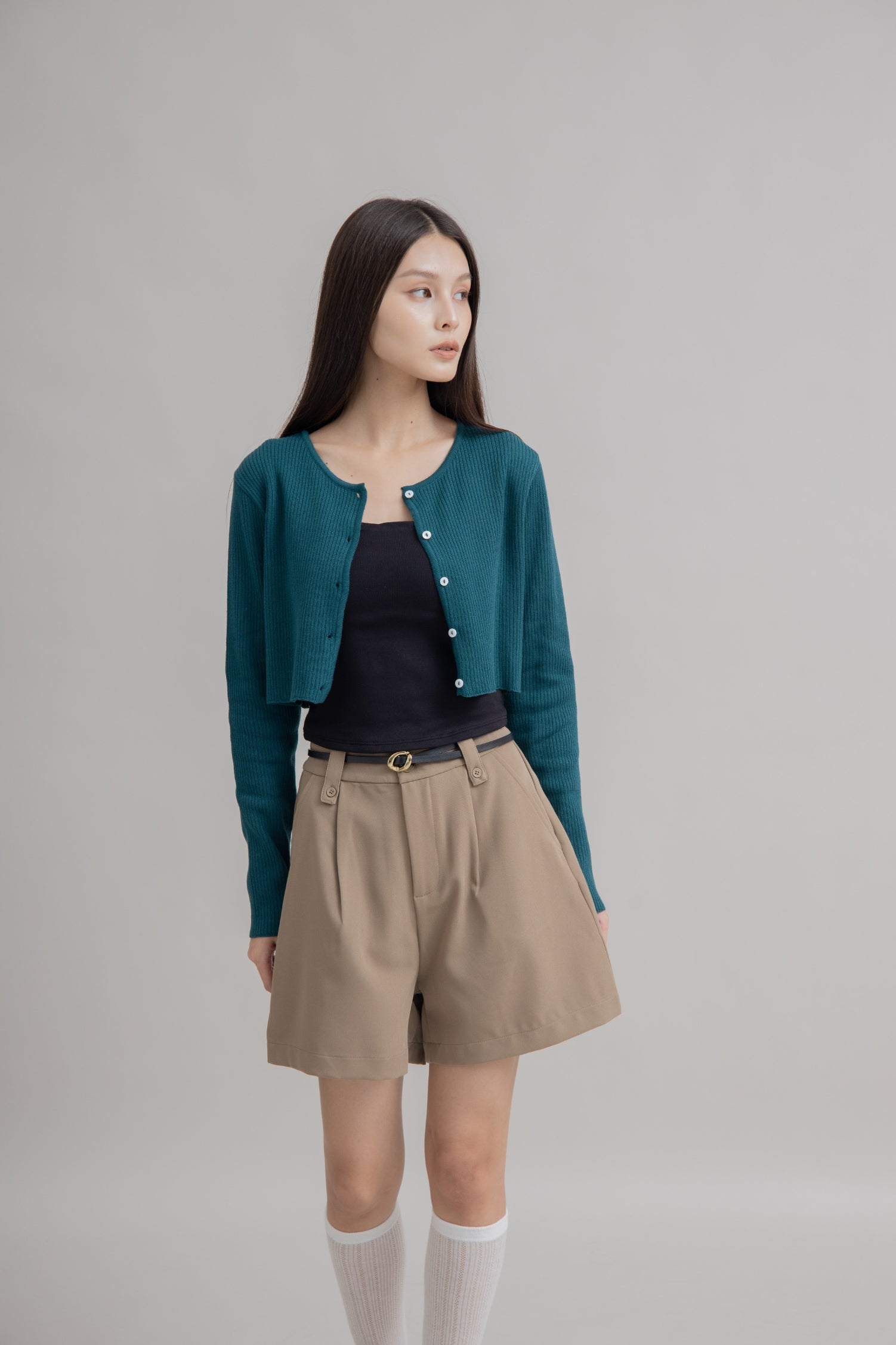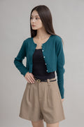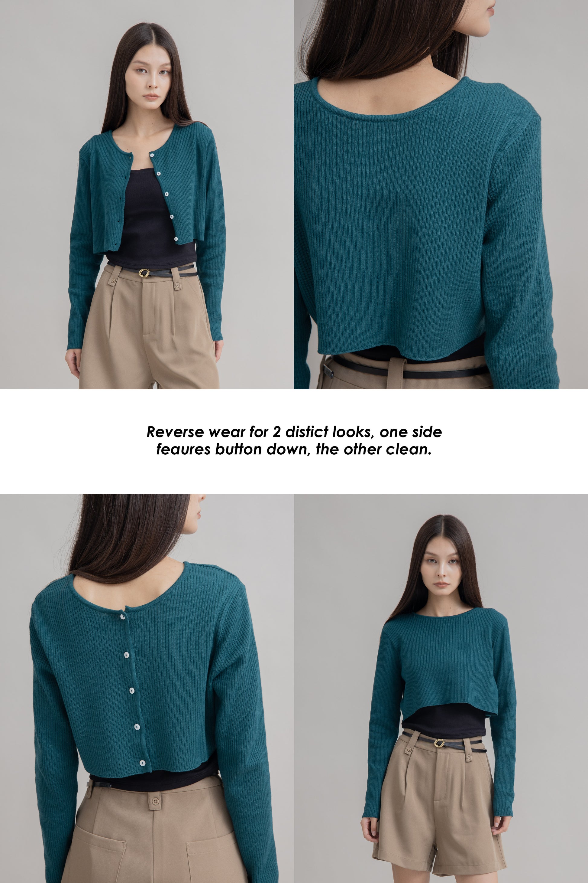 Double the style, one effortless piece. This crop knit cardigan is crafted from 100% recycled polyester and designed to be worn in two ways — with a sleek, clean front for a minimalist look, or reversed to showcase the classic button-down style. Available in Grey Melange and Teal, it’s soft, lightweight, and versatile, making it perfect for layering or as a chic standalone top.
