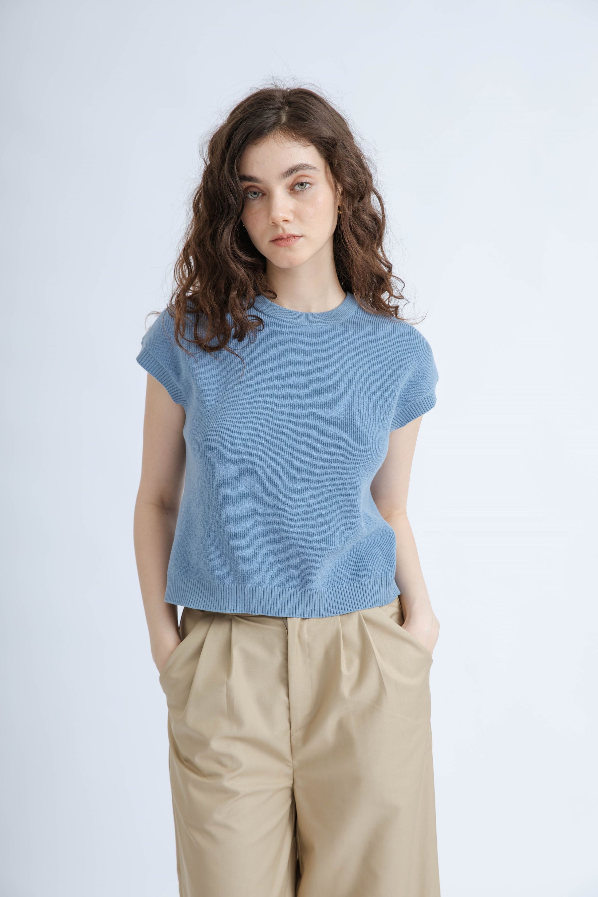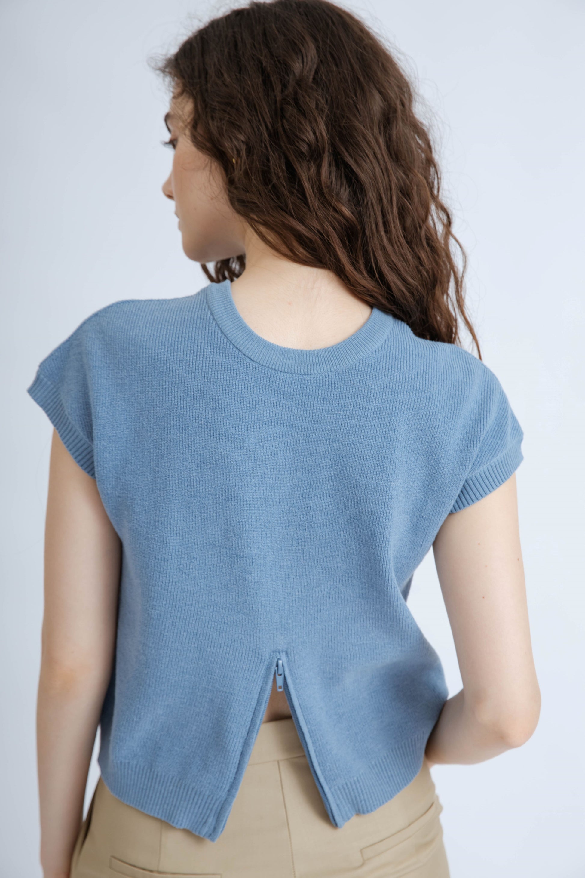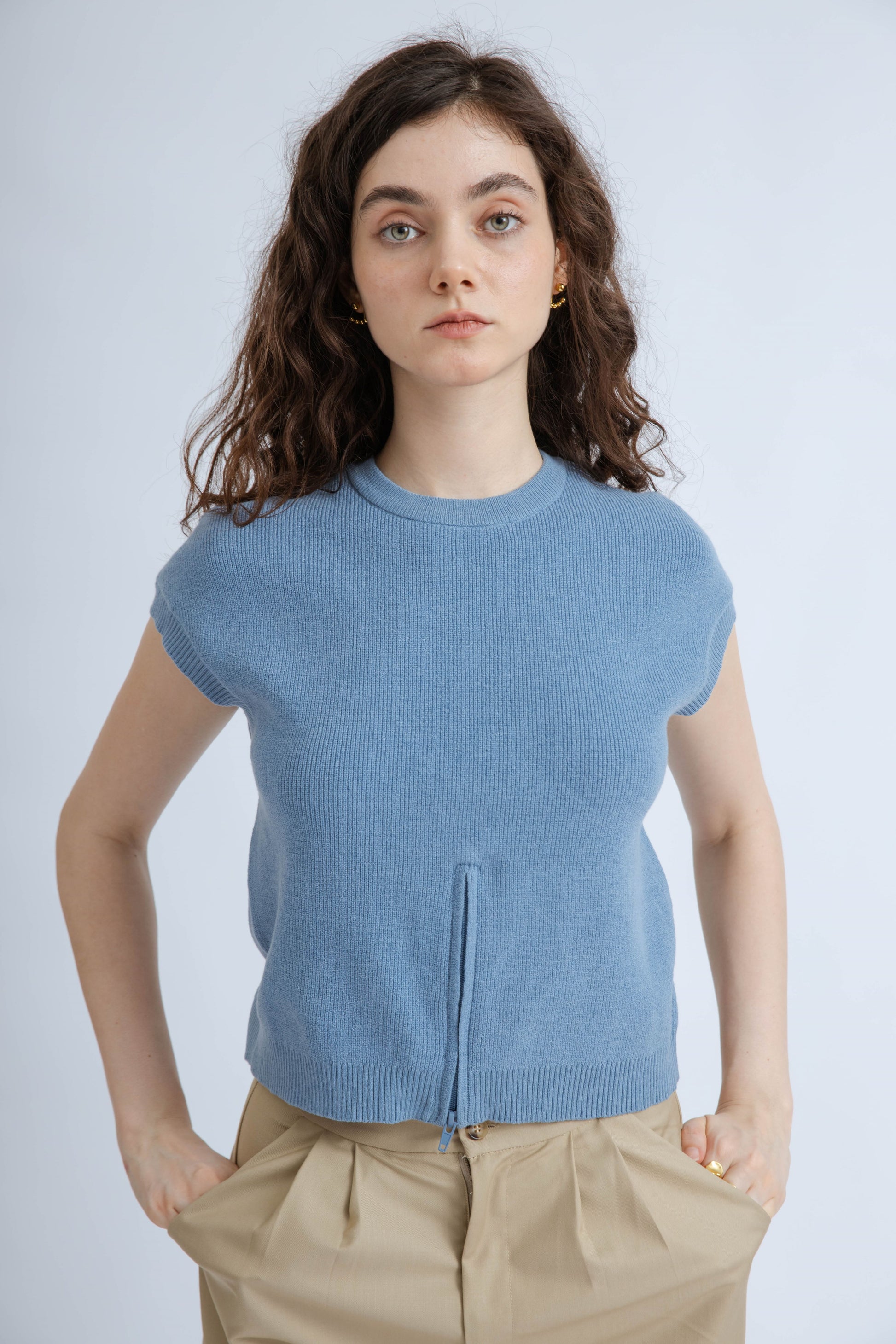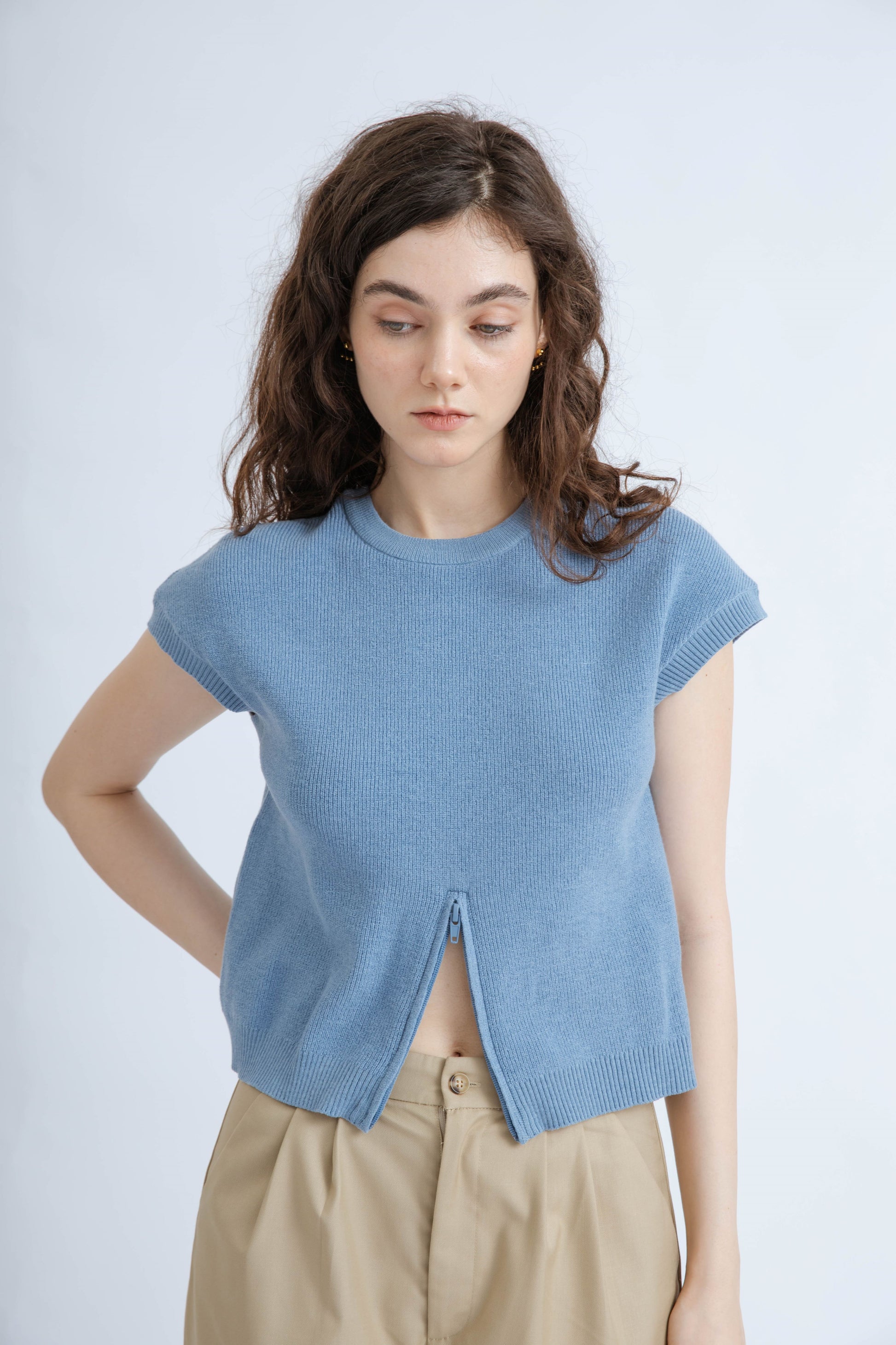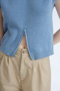 Elevate your everyday essentials with this modern sleeveless knit top, crafted from 90% recycled polyester and 10% nylon for a soft, lightweight feel with a subtle sheen. Designed with clean lines , this piece features a unique zippered slit at the hem—allowing you to customize your silhouette with a hint of edge.