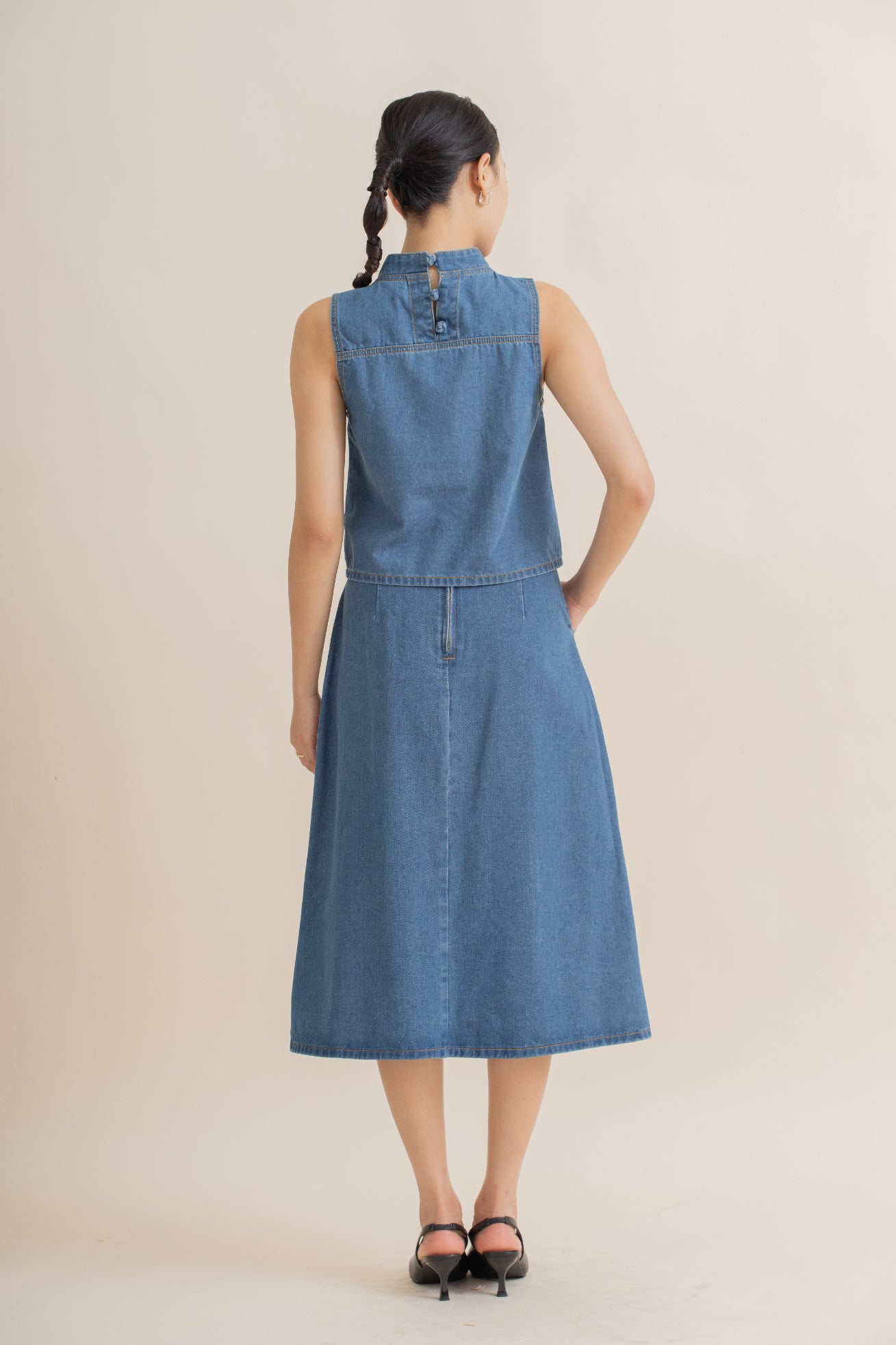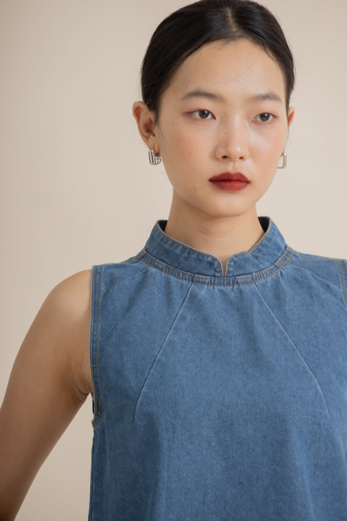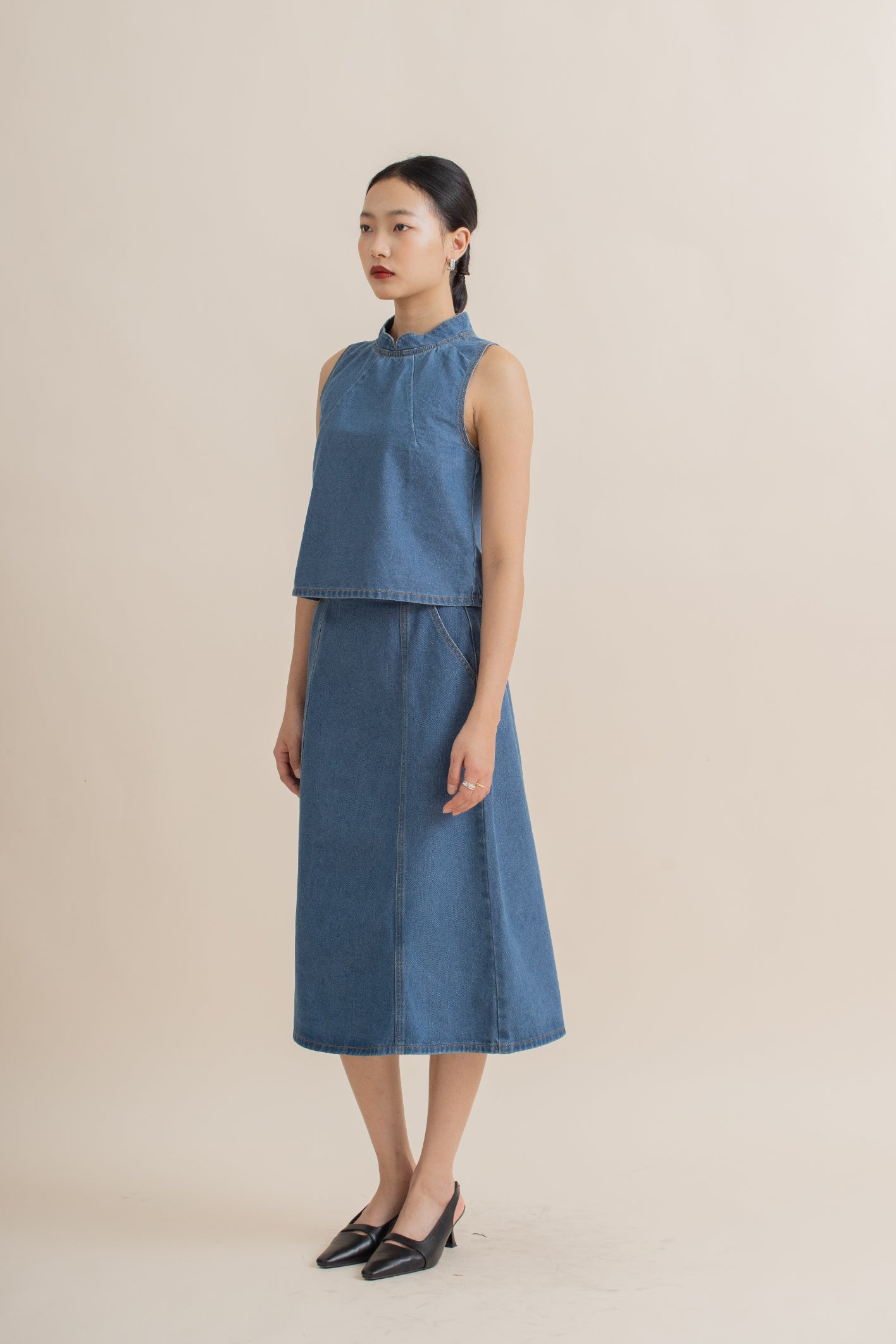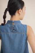Effortlessly stylish, this sleeveless top features a mandarin collar with subtle neck pleats that add texture and refined detail. Crafted from a comfortable blend of 70% cotton, 25% polyester, and 5% viscose, it offers soft breathability with a smooth drape. The washed denim finish brings a relaxed, modern touch, making it versatile for both casual and semi-formal looks. Pair it with skirts, jeans, or tailored trousers for an easy, polished outfit.