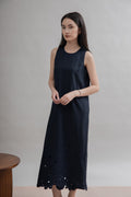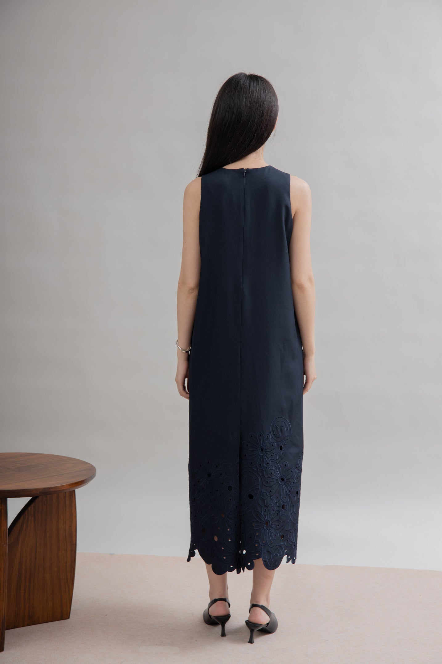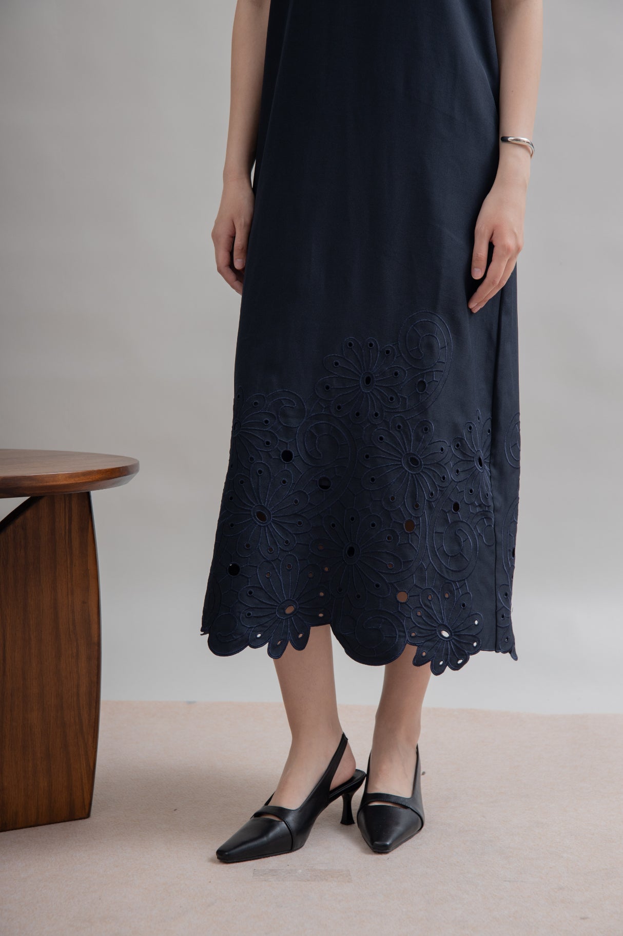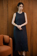 This sleeveless long dress in deep navy blends understated elegance with thoughtful detail. Crafted from a smooth, stretchy blend of 95% polyester and 5% spandex, it offers a flattering drape that flows effortlessly. The highlight lies at the hem—adorned with delicate tonal floral embroidery that adds a subtle touch of texture and charm.
