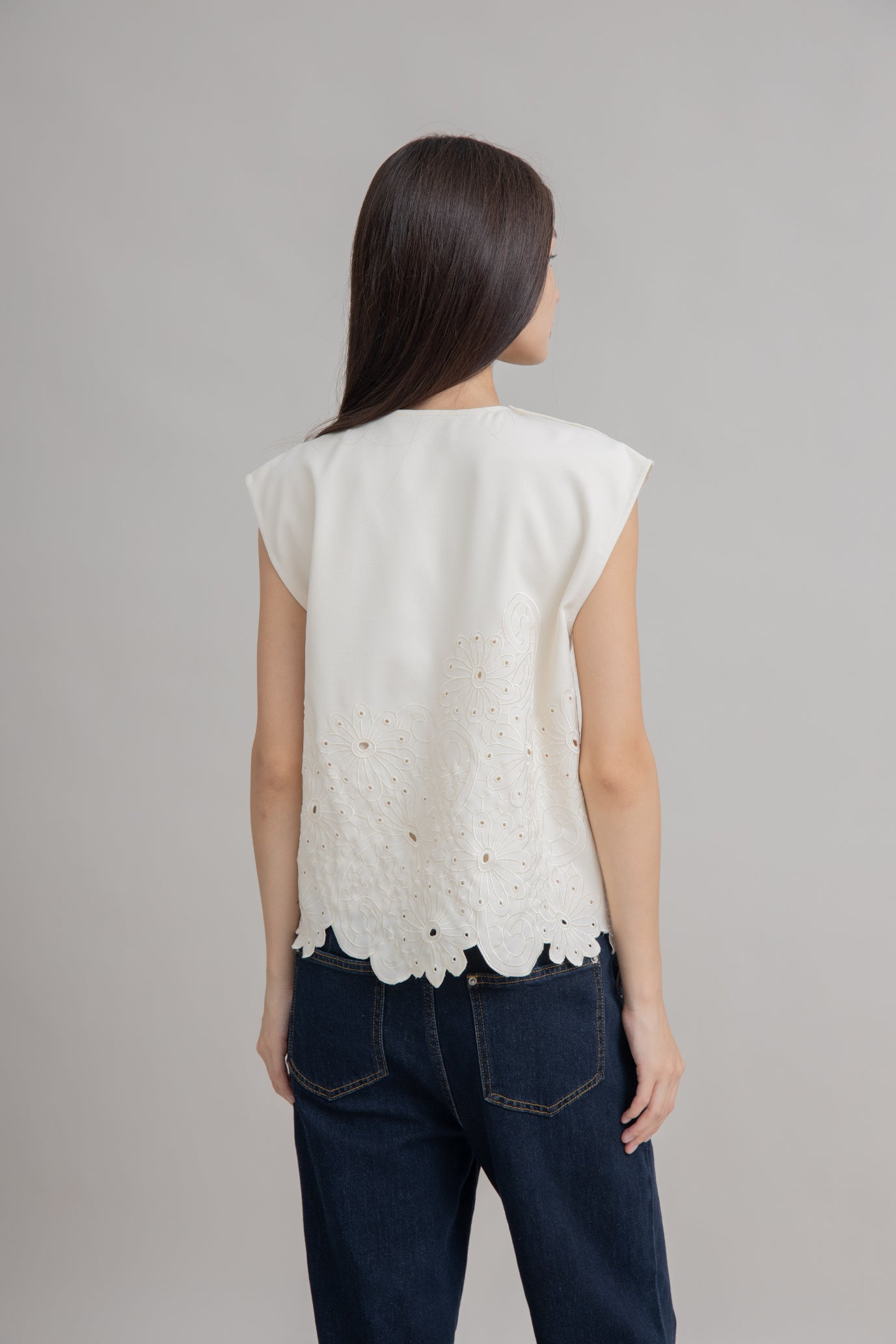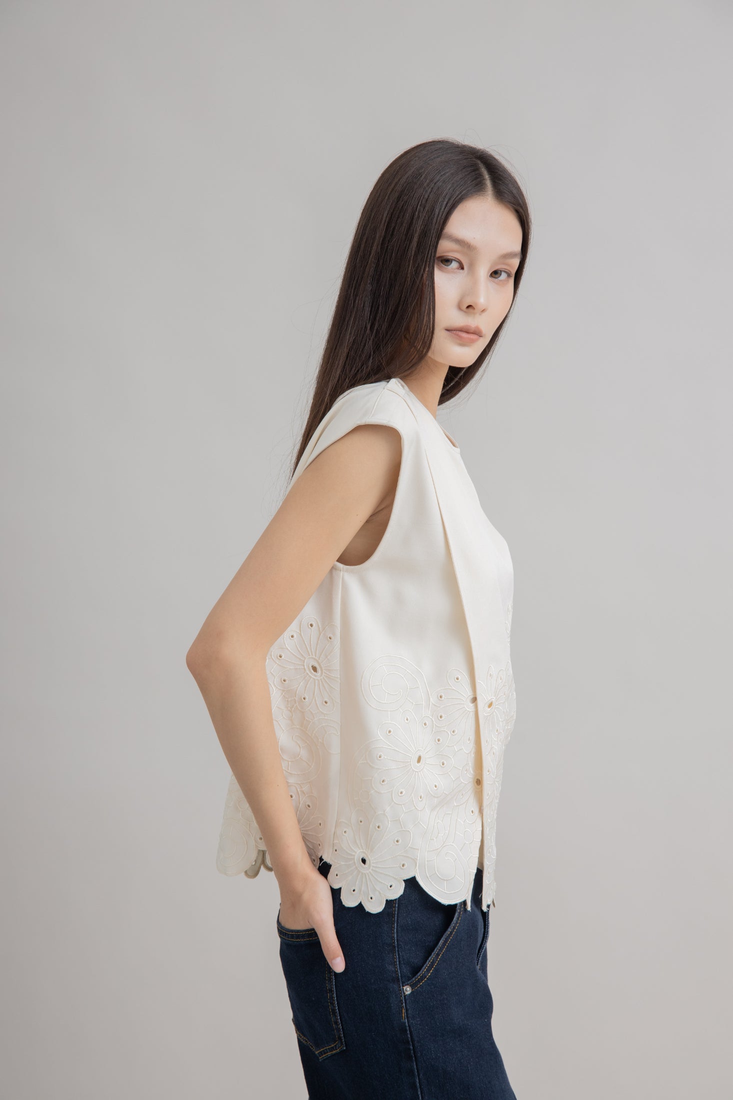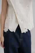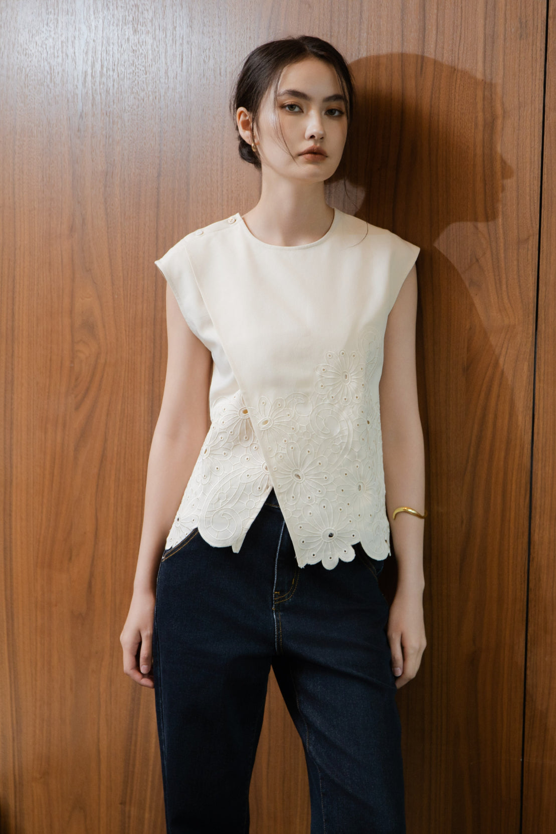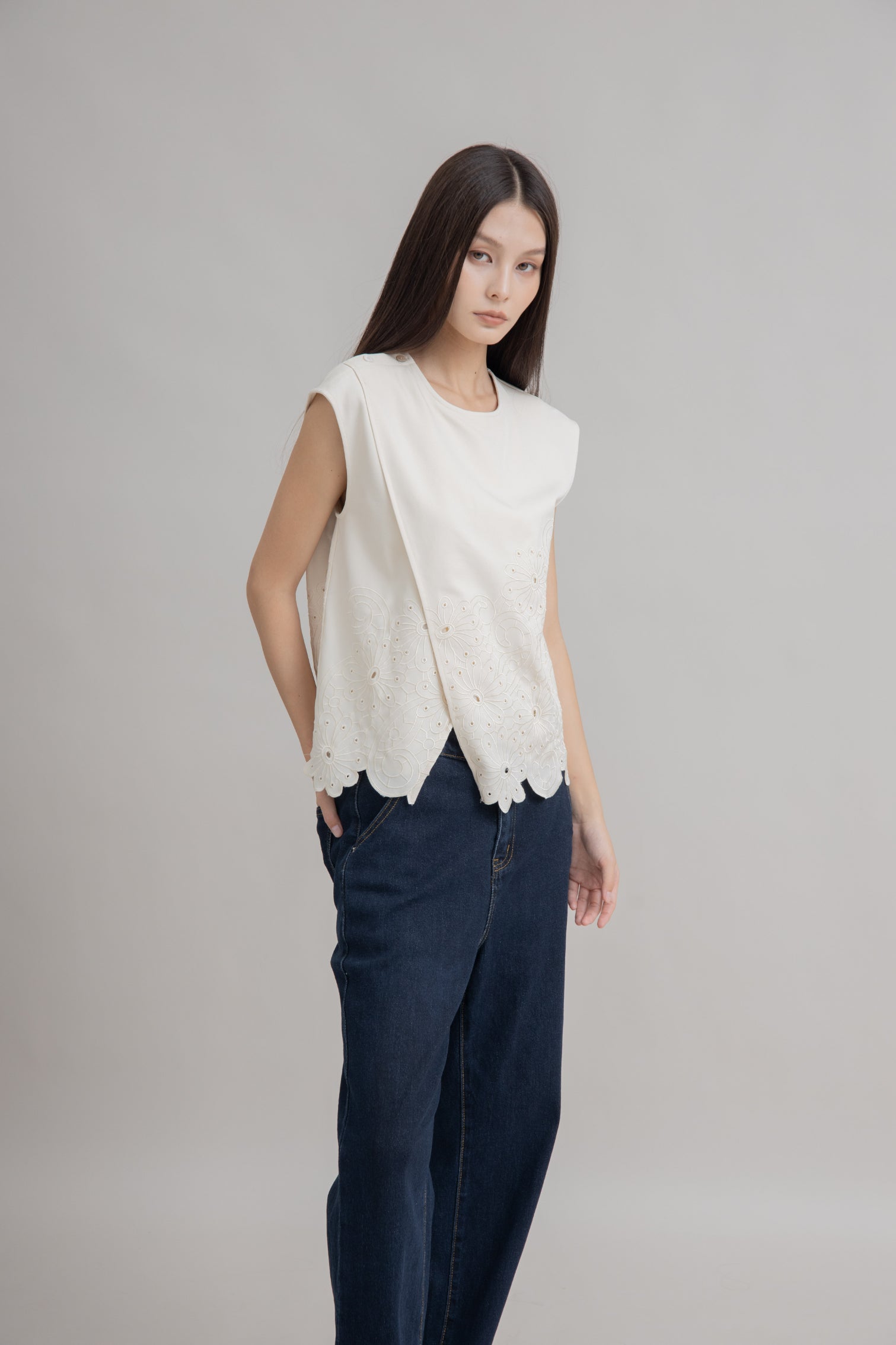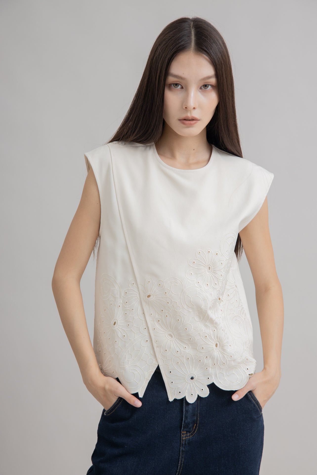 Shimmer meets subtle romance. This sleeveless top is crafted from a luxe blend of 95% lurex and 5% nylon, giving it a soft sparkle with every movement. The overlap design creates a flattering layered effect, while the delicate floral embroidery at the hem adds a feminine finish. Lightweight yet eye-catching, it’s the perfect piece to dress up for special occasions or to elevate everyday looks with a touch of shine.