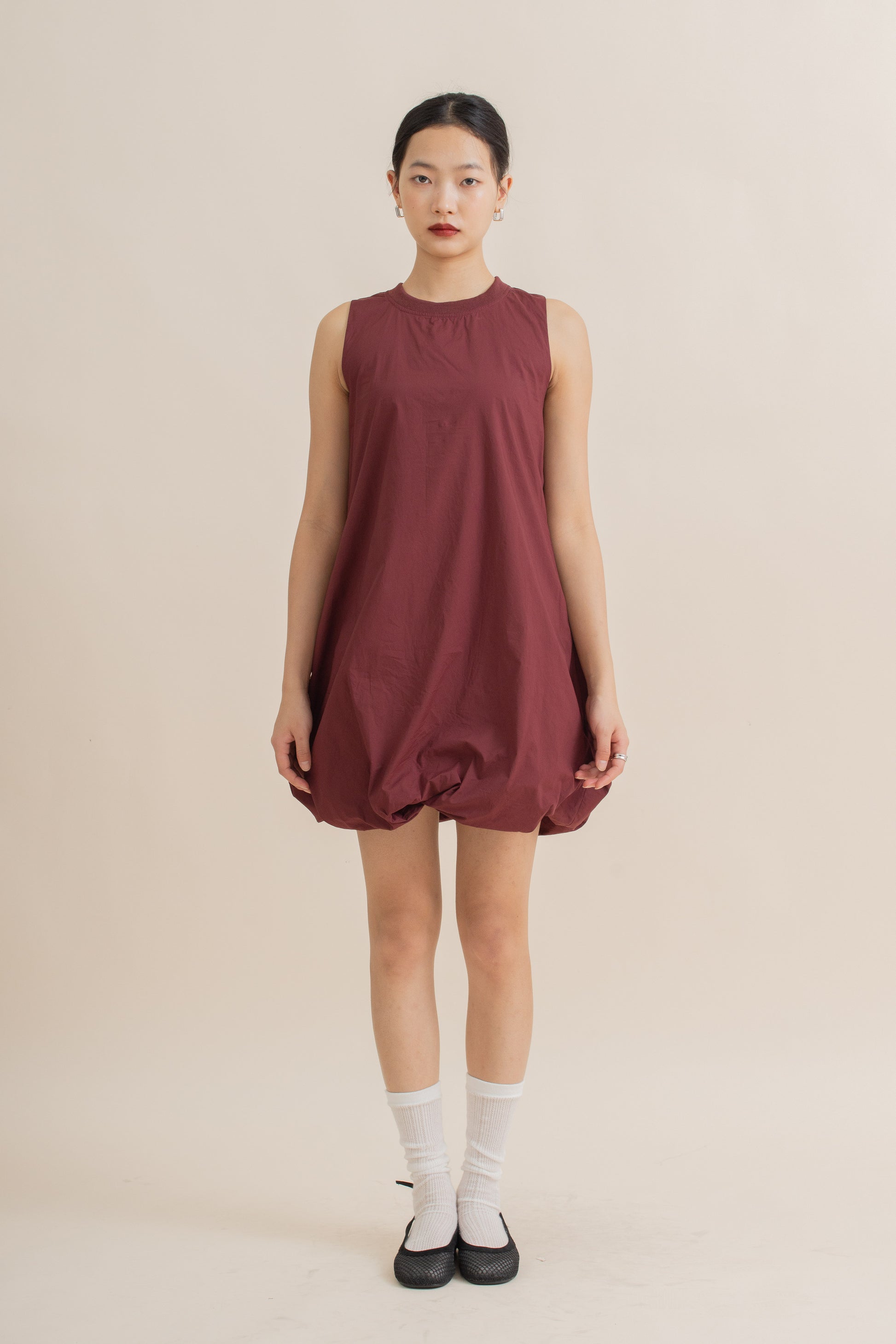 Playful volume meets effortless comfort. This sleeveless short dress features a distinctive puffy balloon hem, creating a soft and sculptural silhouette that flatters with ease. Crafted from a breathable blend of 100% Cotton, it drapes beautifully while keeping you cool and comfortable.
