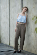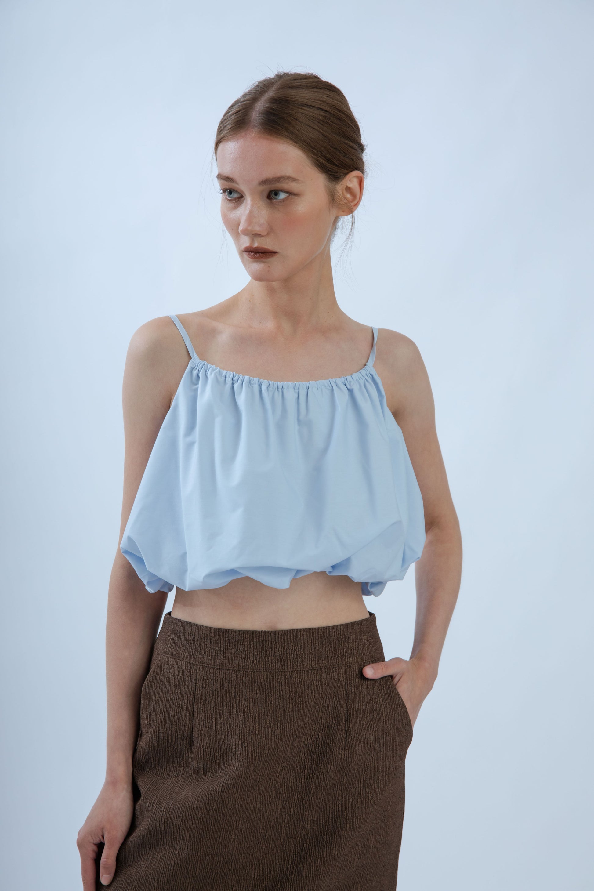 Light as air with a soft, sculpted shape. This puffy spaghetti strap top is crafted from a breathable blend of 65% tencel and 35% cotton, offering a cloud-like feel with a subtle structure. The airy silhouette is balanced by delicate straps and gentle volume through the body, creating a modern bubbly look.