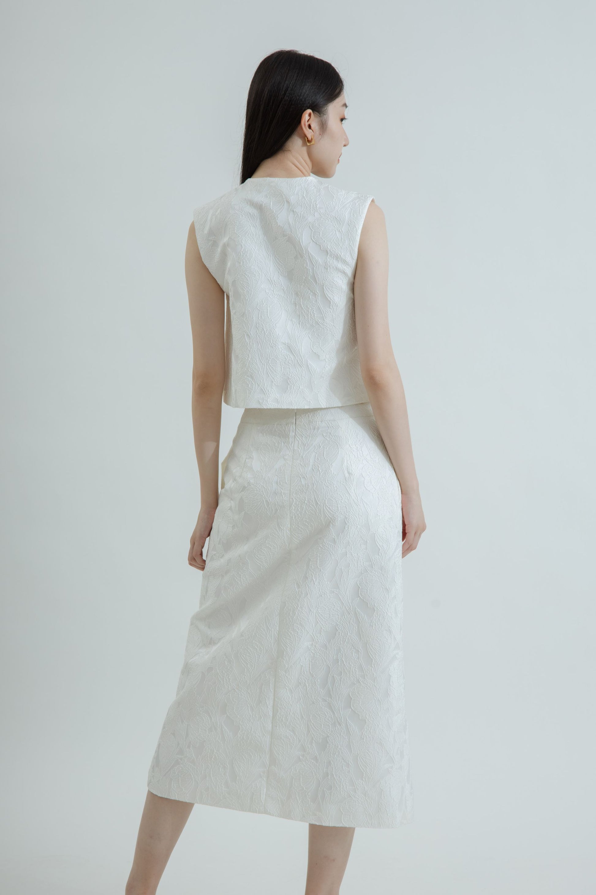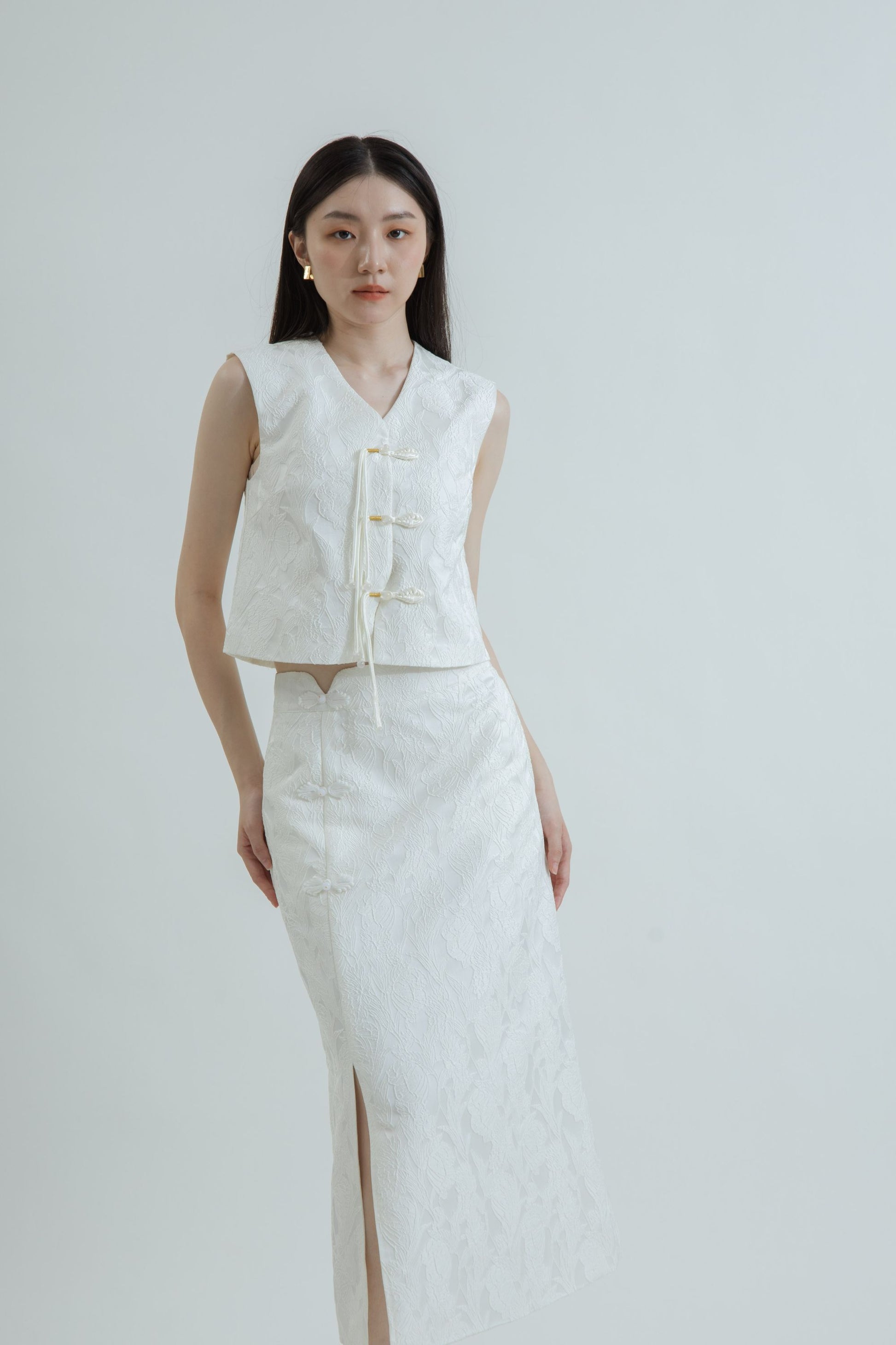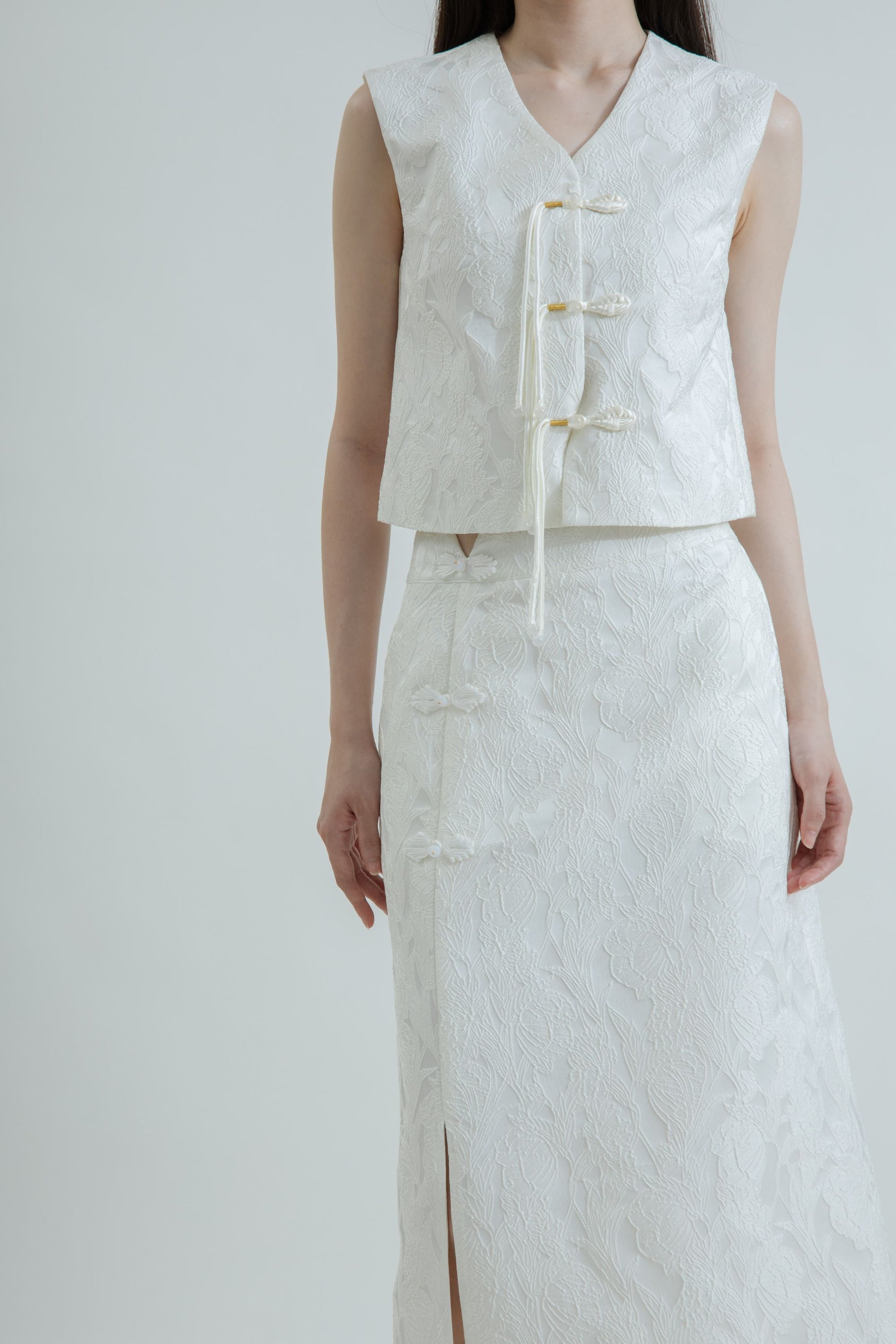 A refined midi skirt crafted from 100% polyester with a subtle textured pattern. Designed with fabric toggle details and a front slit that offers ease of movement and a touch of allure. Tailored to flatter the form while keeping a graceful, polished finish — perfect for both day and evening wear.
