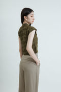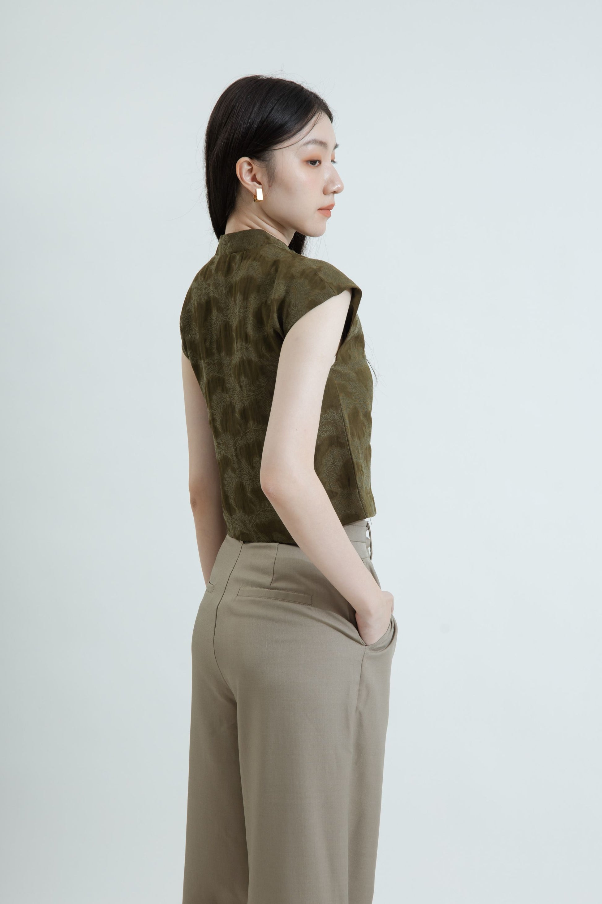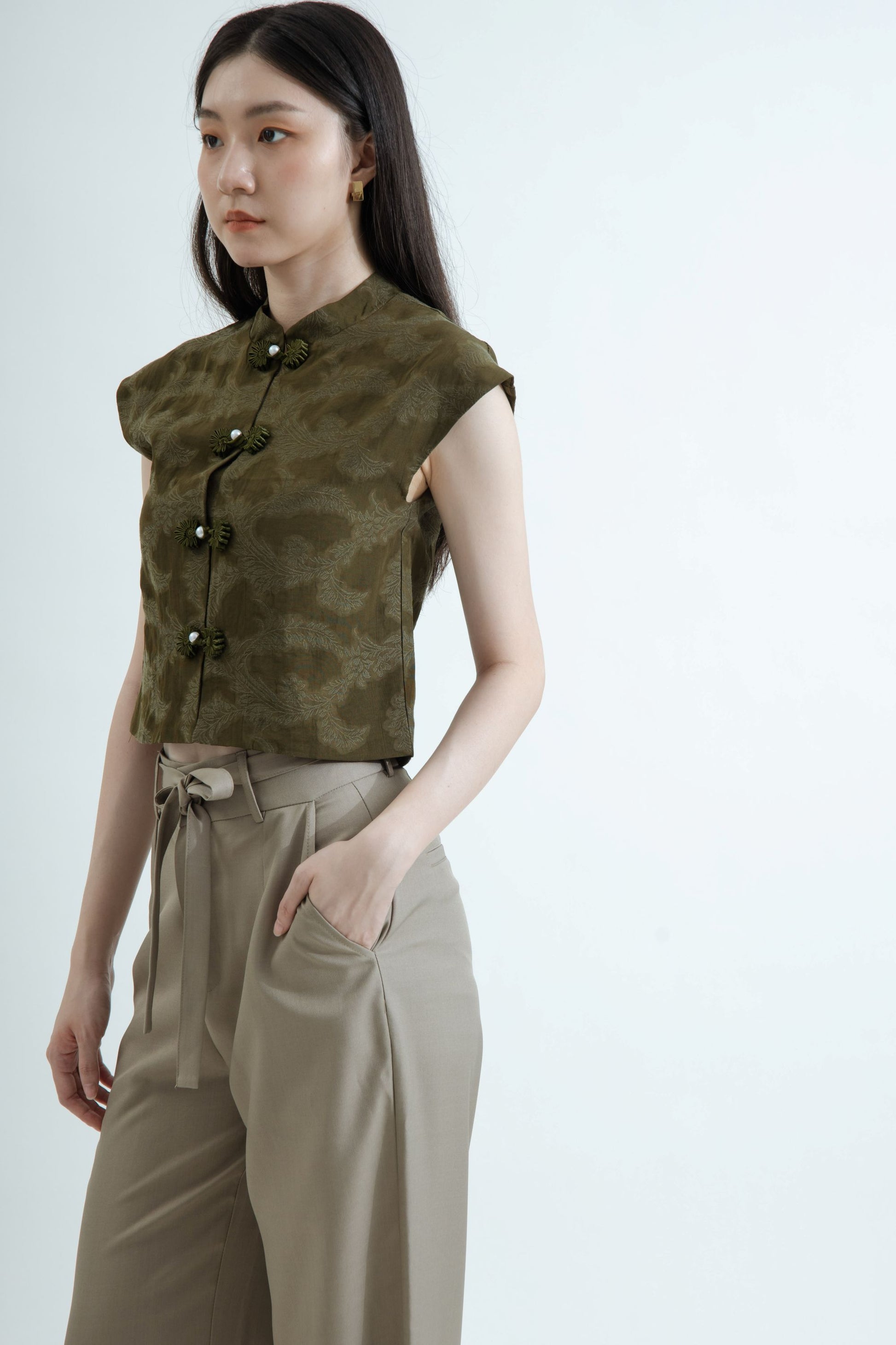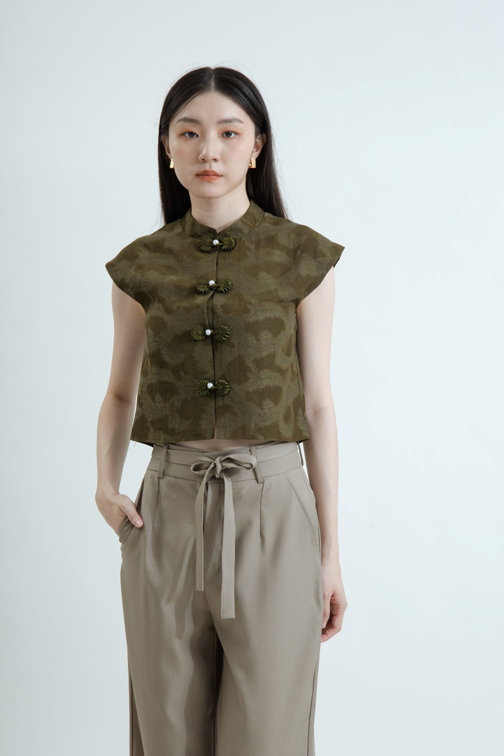 A refined cheongsam-inspired top crafted from a 50% Rayon, 30% Tencel, 20% Linen blend. Designed with a mandarin collar, sleeveless silhouette, and floral pleated buttons that add a soft, feminine charm. The cropped cut brings a modern touch to a timeless form.