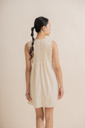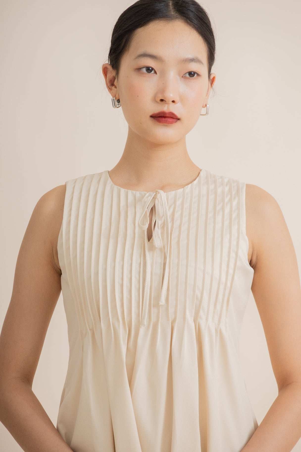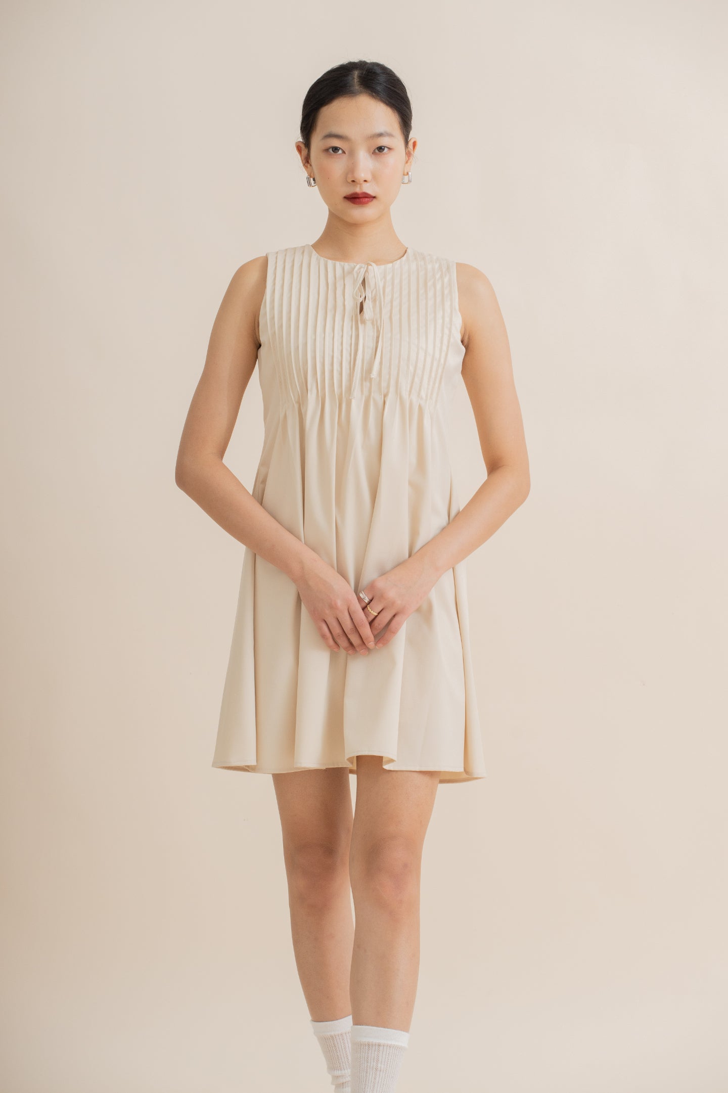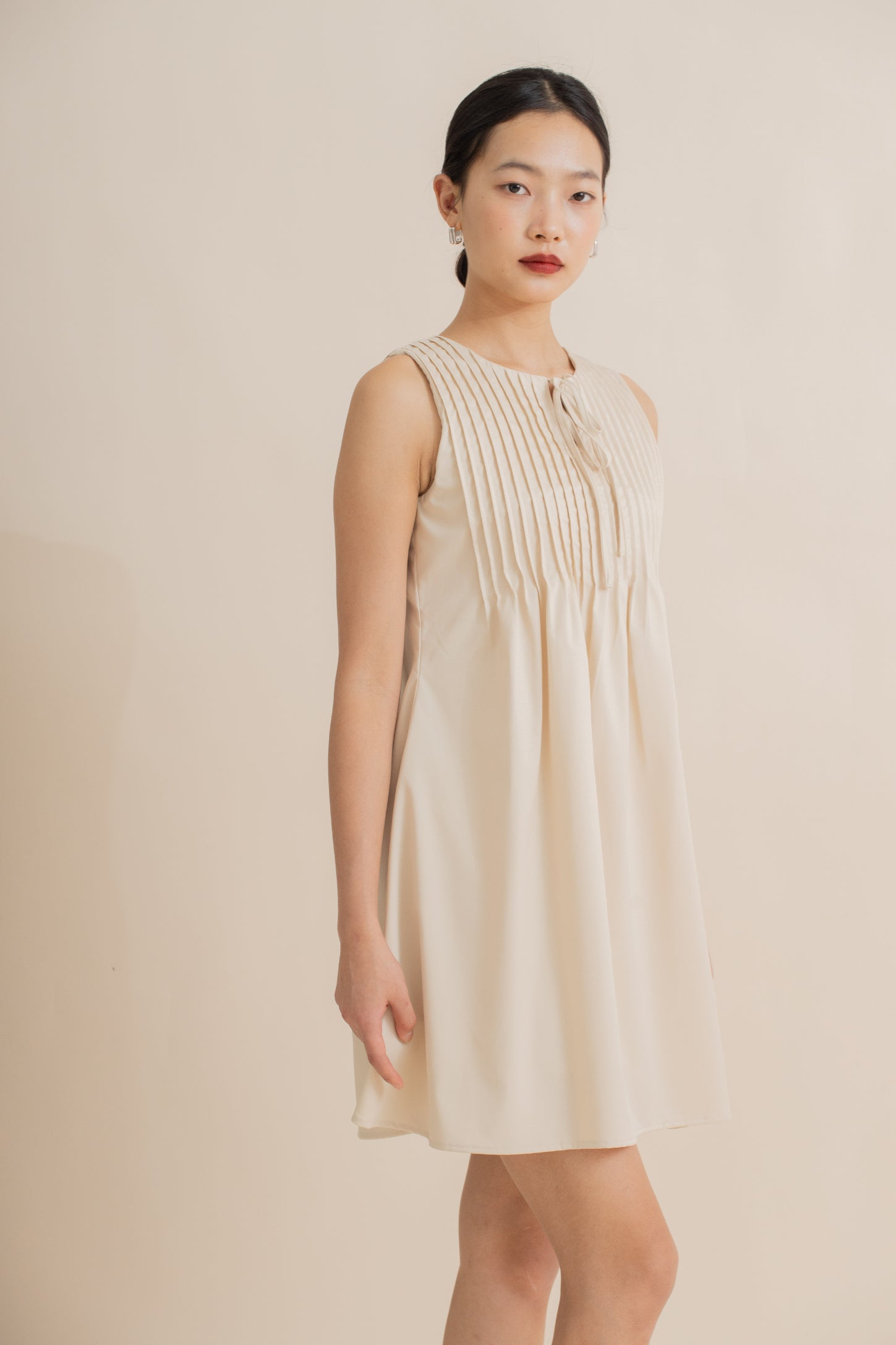 Effortless elegance meets playful charm with this sleeveless dress, featuring delicate pintuck detailing and a front ribbon tie that adds a feminine, flattering touch. Crafted from a comfortable blend of 77% polyester, 20% modal, and 3% spandex, it offers a soft, lightweight feel with gentle stretch for ease of movement. Available in red and beige, this versatile dress is perfect for casual outings, brunches, or daytime events, making it a chic addition to any wardrobe.