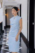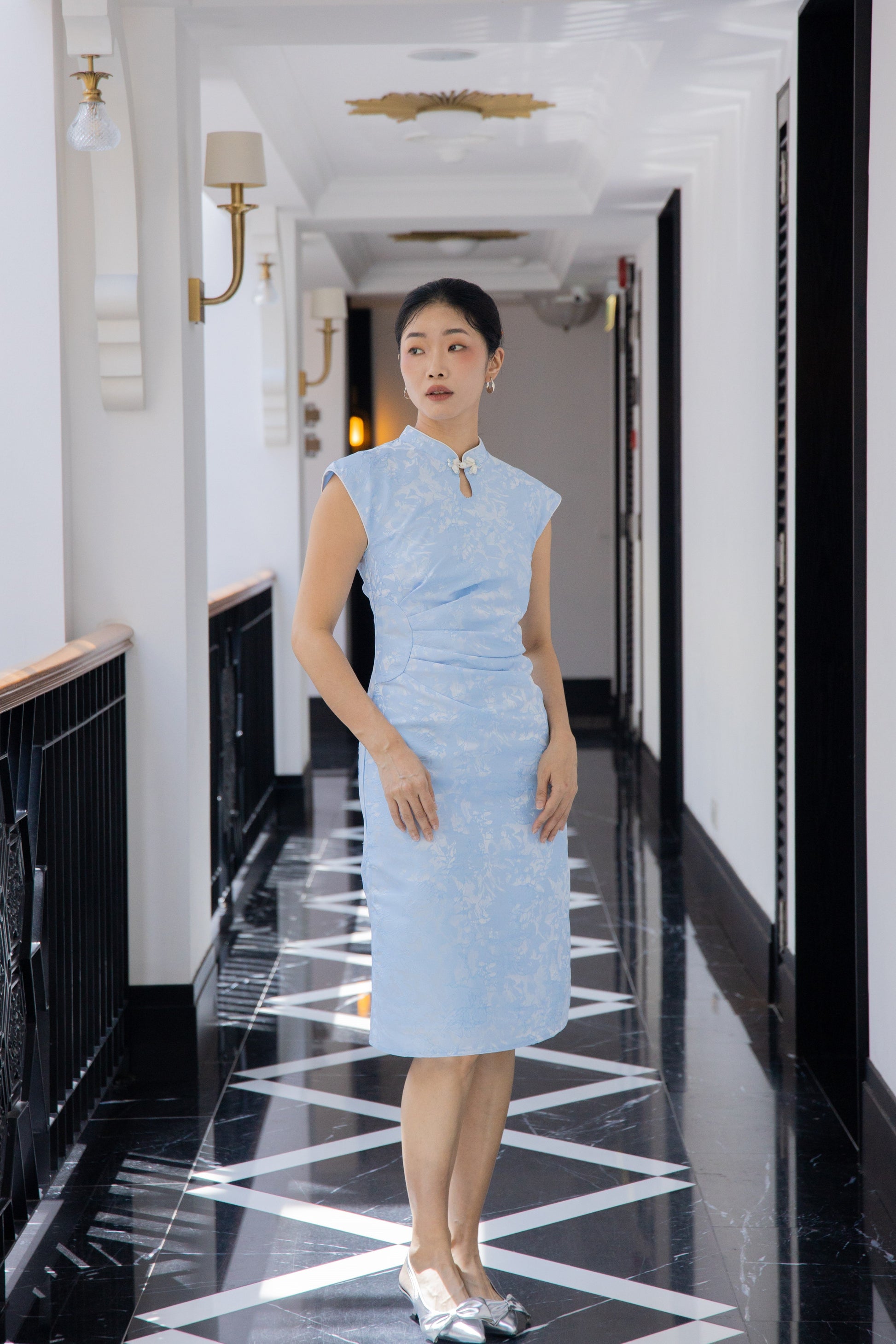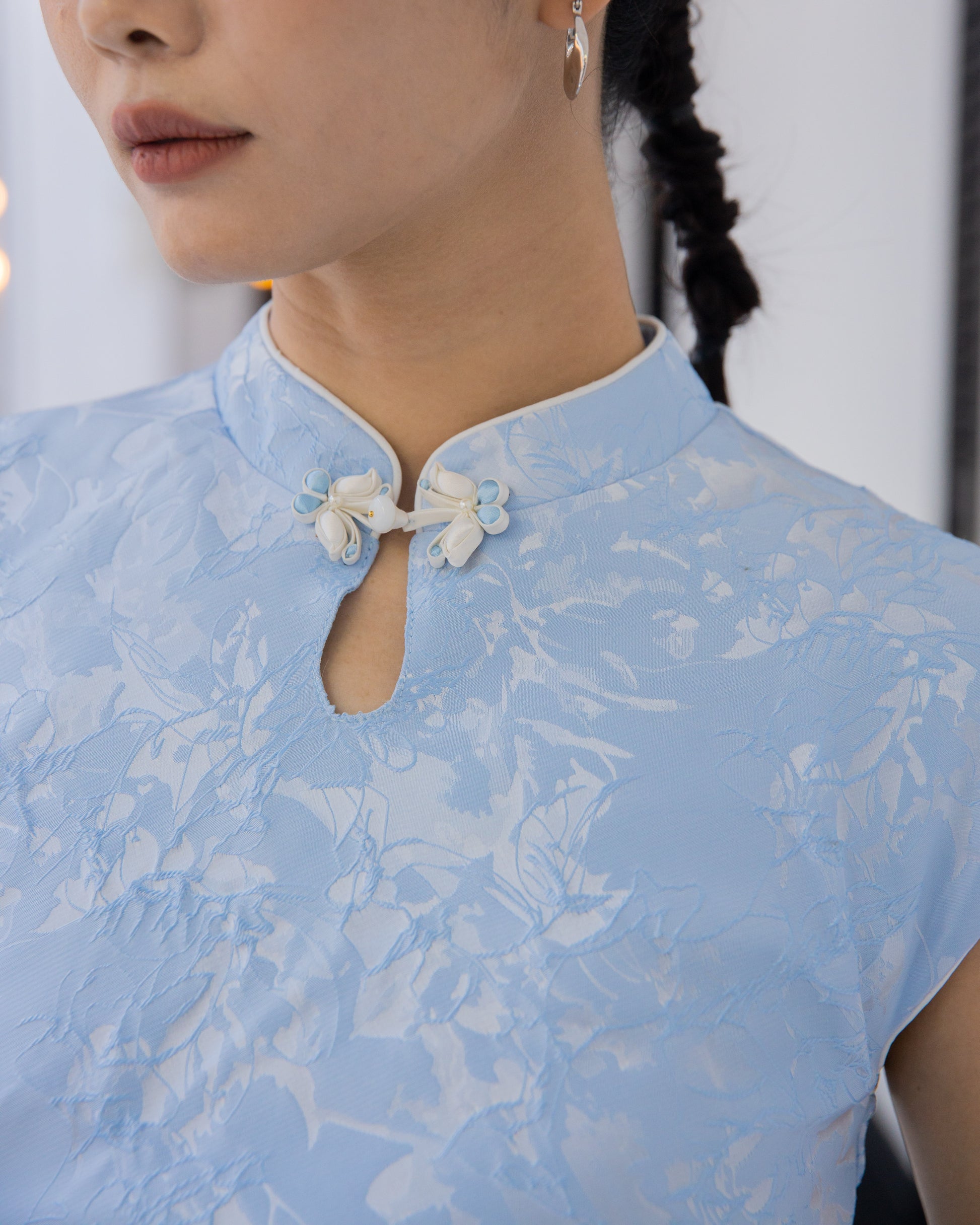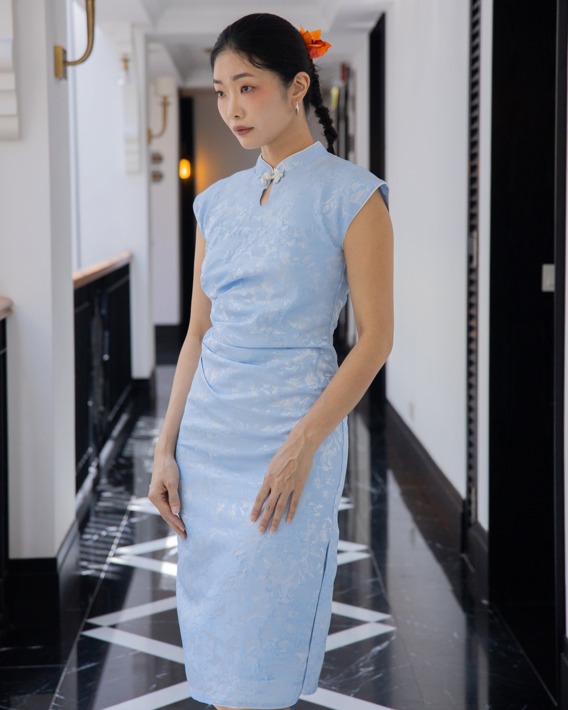 Spring Aura Embroidery Gathered Cheongsam Dress (Blue)