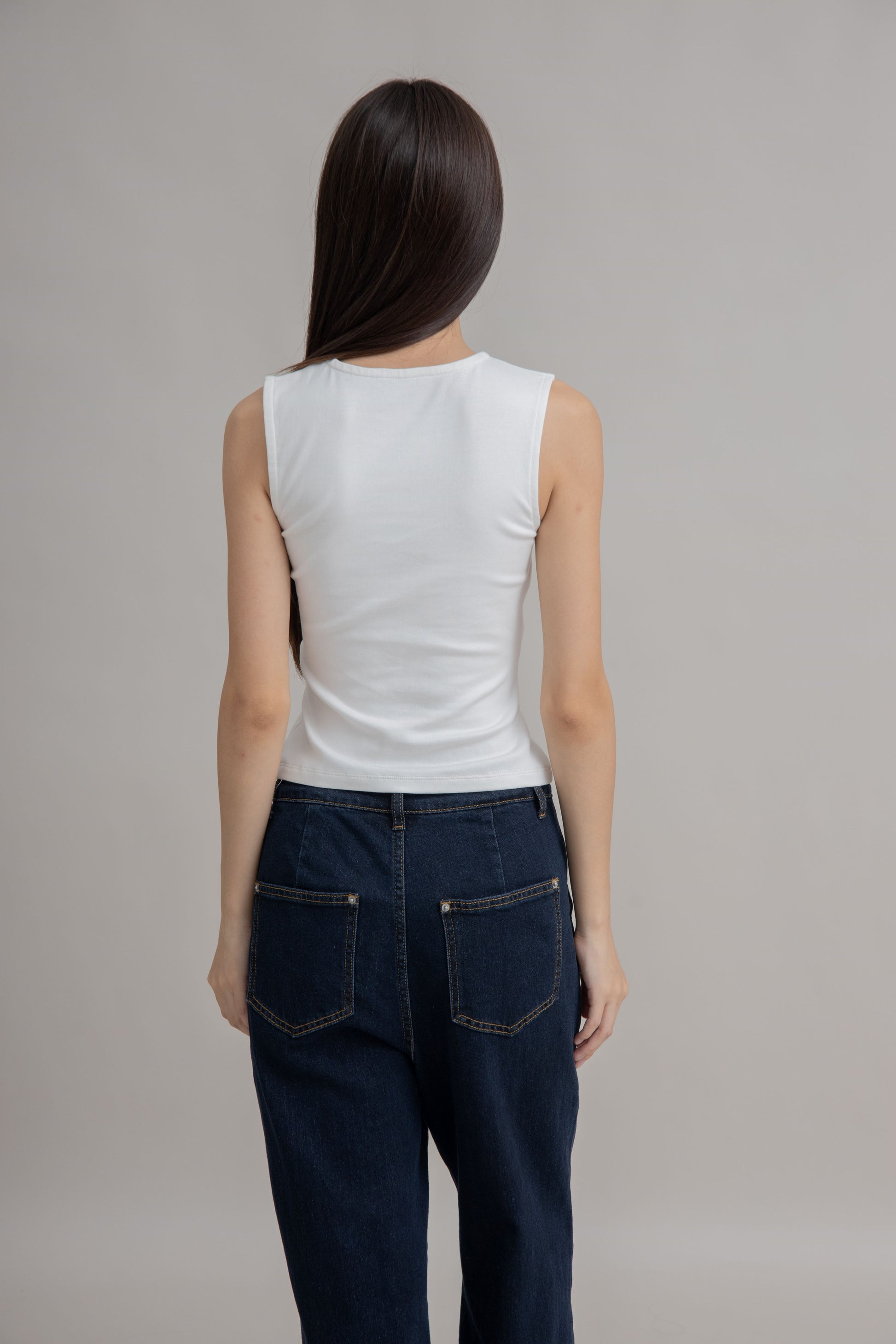 Effortlessly feminine, this Twisted Ribbon Front Sleeveless Top features a delicate ribbon twist detail at the front that adds charm to a simple silhouette. Made from a soft and breathable blend of 96% cotton and 4% spandex, it offers a comfortable stretch and a flattering fit. A versatile piece that pairs easily with skirts, denim, or tailored bottoms for both casual and chic looks.