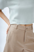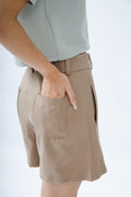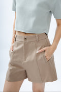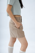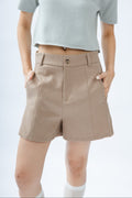 A modern take on classic tailoring, these khaki shorts are crafted from a structured polyester fabric that holds its shape while offering all-day comfort. Designed with clean lines and a flattering high-waist fit, they feature front pleats, side slit pockets, and a single-button closure for a polished finish. Crafted from 100% polyester, they’re lightweight, breathable, and quick-drying — perfect for warm days on the go.