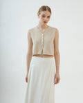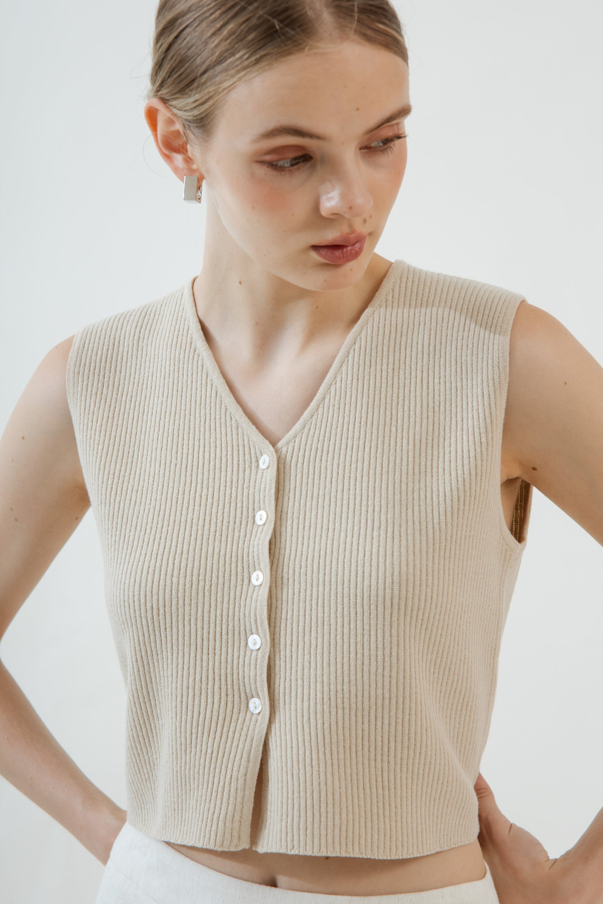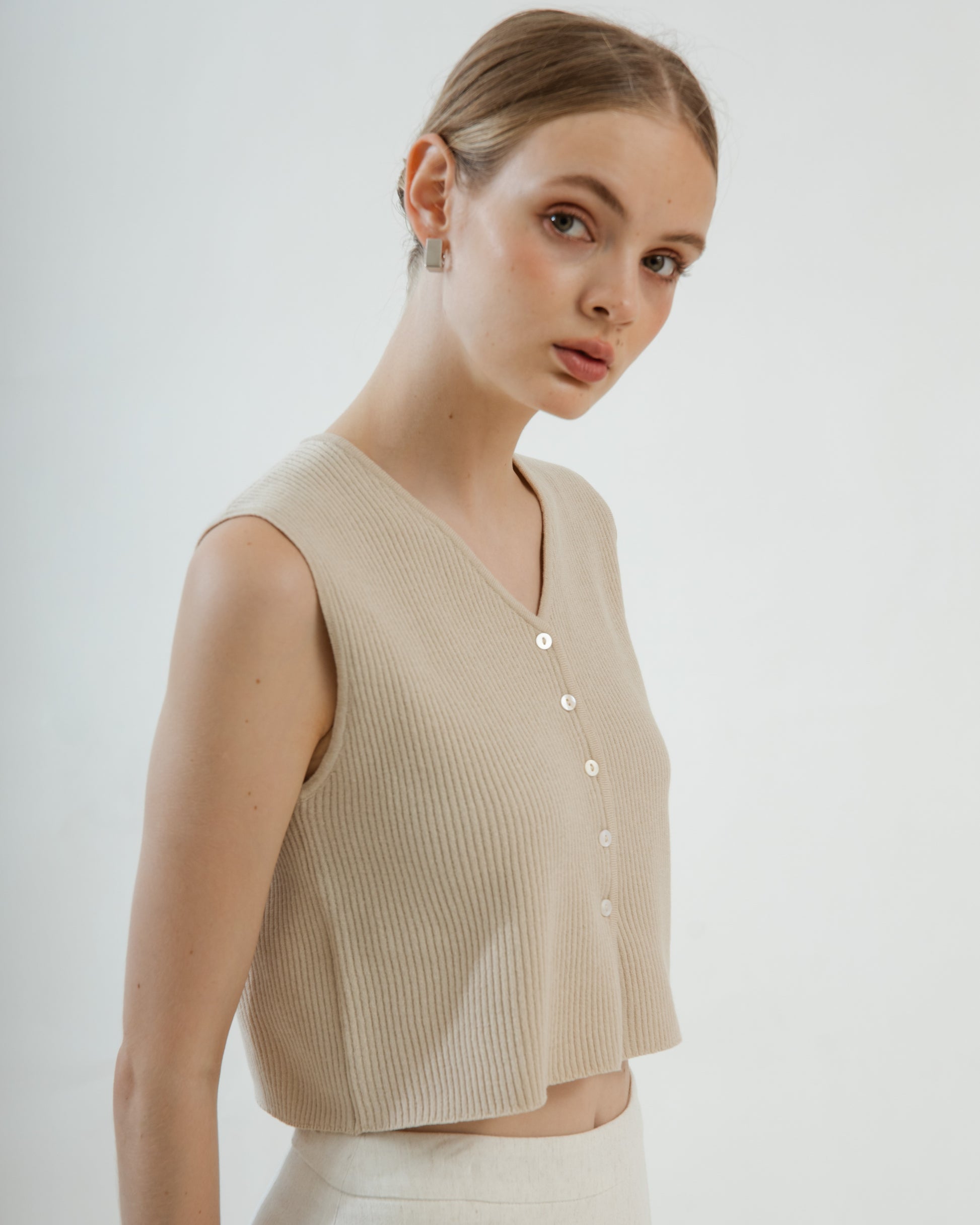 Designed for effortless elegance, the V Neck Sleeveless Ribbed Knit Top (Beige) features a sleek ribbed texture that enhances its refined look. Crafted from 90% Recycled Polyester and 10% Nylon, this eco-friendly piece offers a soft, plush feel while remaining breathable. The V-neckline and sleeveless silhouette add to its modern charm, while the button-down front with delicate shell buttons brings a touch of sophistication. Minimalist yet versatile, it's perfect for layering or wearing on its own.