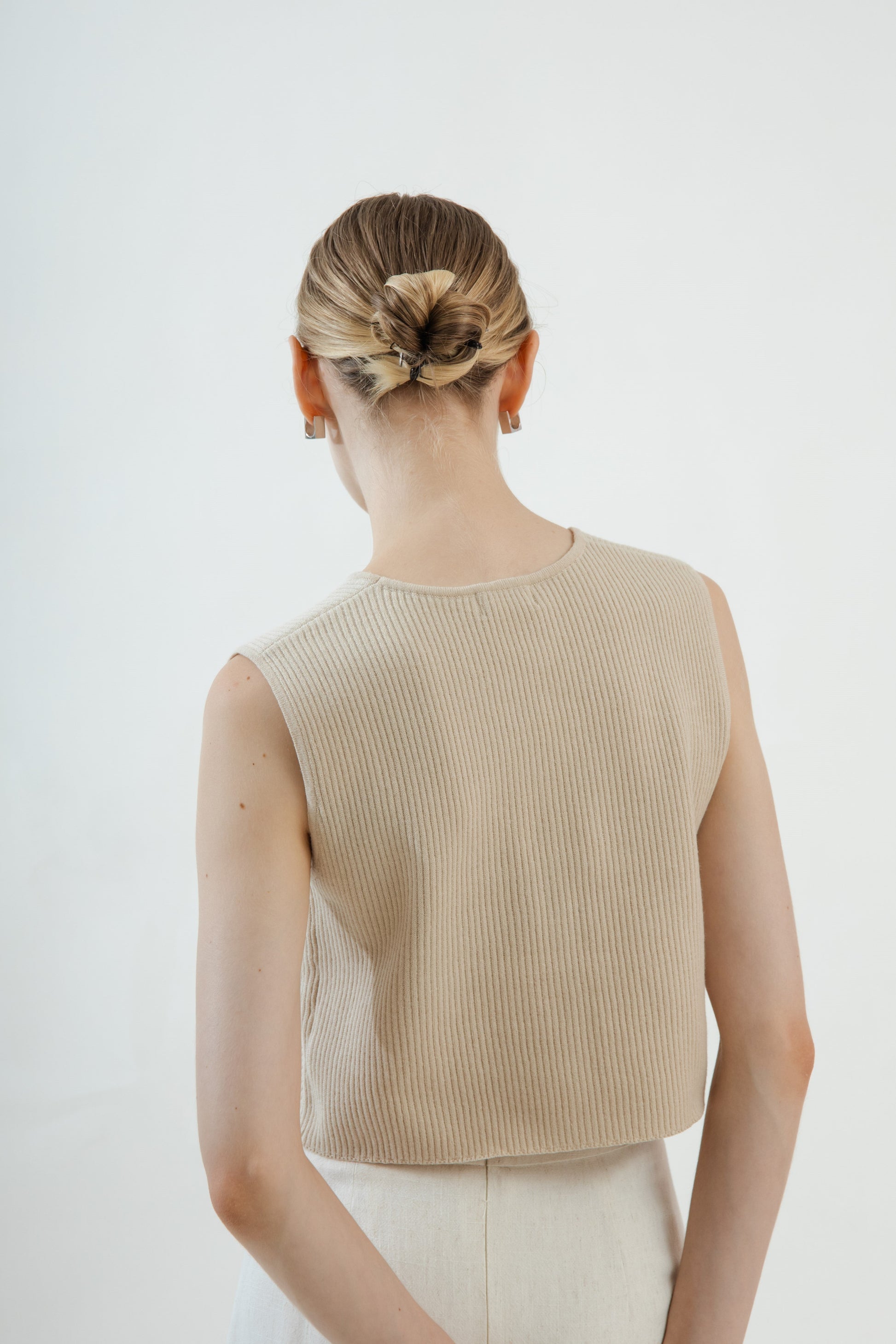 V Neck Sleeveless Ribbed Knit Top (Beige)