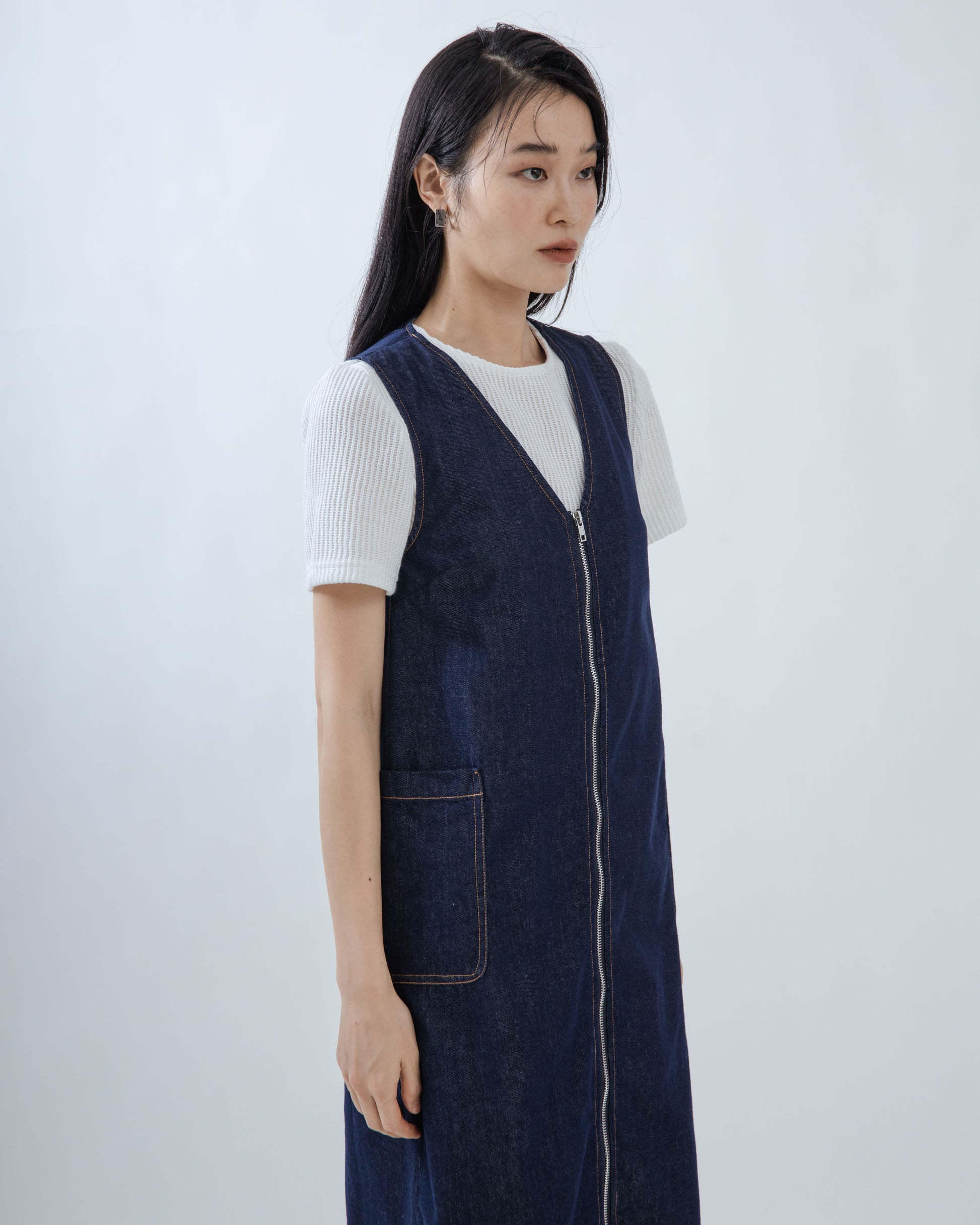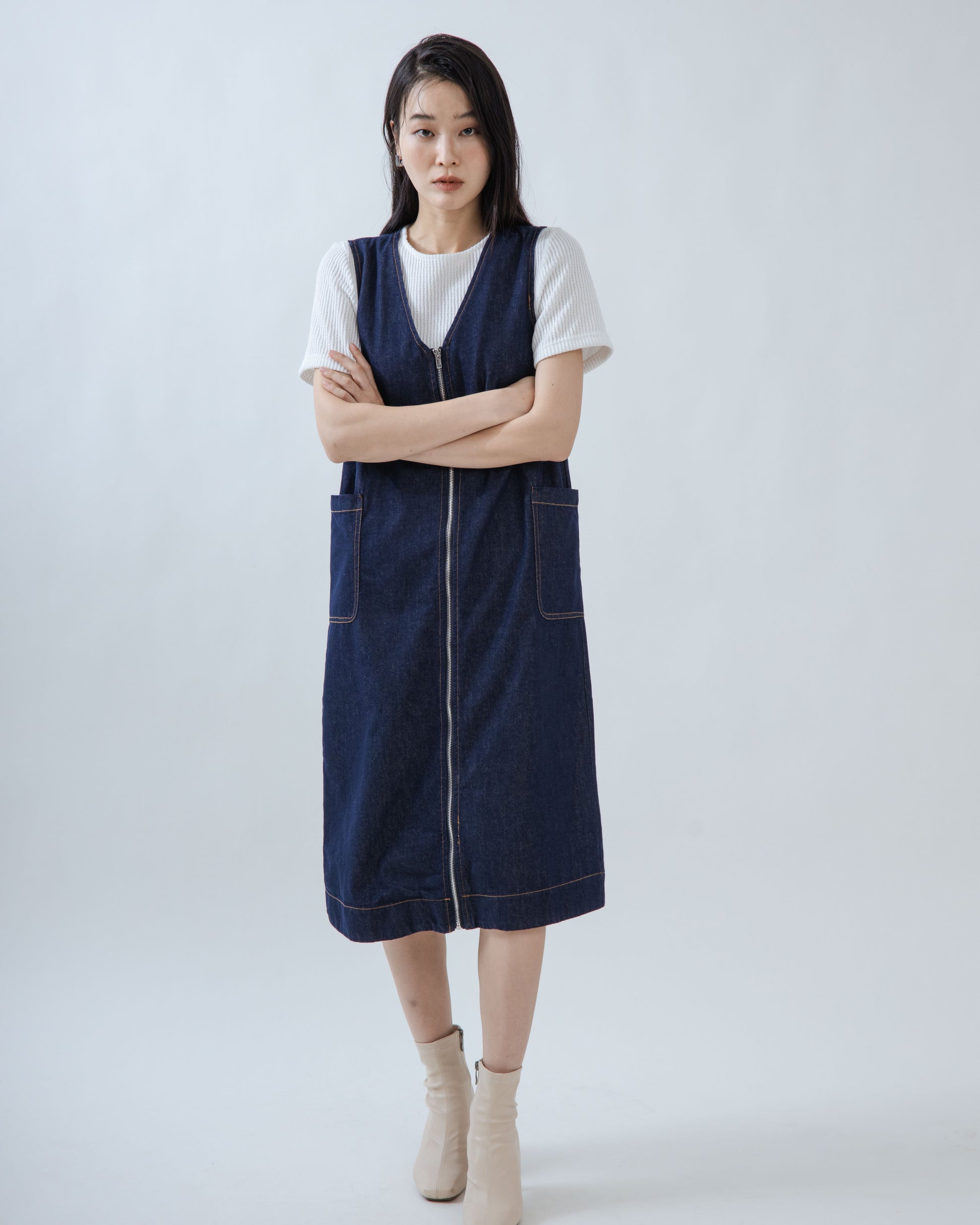 The V Neck Zipper Sleeveless Denim Dress in Denim, made from 100% Cotton, features a flattering V-neck design with a silver zipper detail at the center, adding a touch of modern style. The dress includes two side pockets for practicality and a youthful, effortless vibe with its sleeveless and age-reducing cut. Its minimalist and vintage-inspired aesthetic makes it a versatile piece that can be worn on its own or layered for different looks, while remaining flattering on a variety of body types.