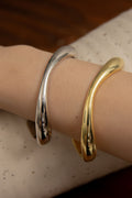 This bangle plays with proportion through a graceful tapered design—featuring a slimmer center that gradually widens toward the ends. The result is a subtle sculptural silhouette that feels both modern and timeless. With its smooth, polished finish and comfortable fit, it’s a quietly bold piece that elevates everyday styling with ease.
